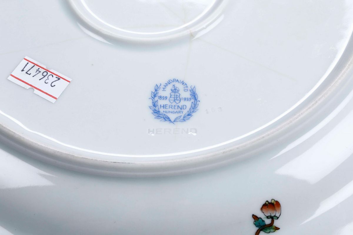 Porcellana policroma. Marca: stemma del giubileo, “Herend Hungary”, “Handpaited” e date 1839 e 1939 in una corona d'alloro in blu; “Herend” impresso. Diametro cm 29. Conservazione: ottima