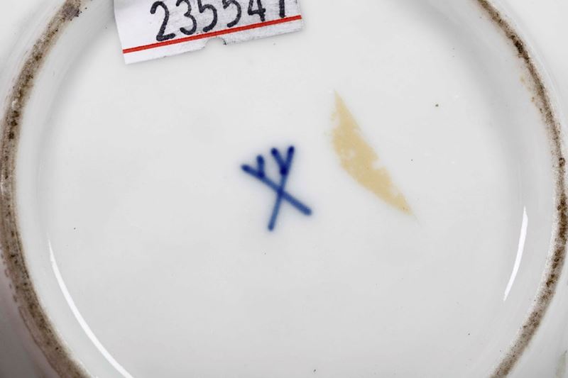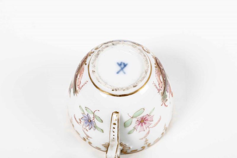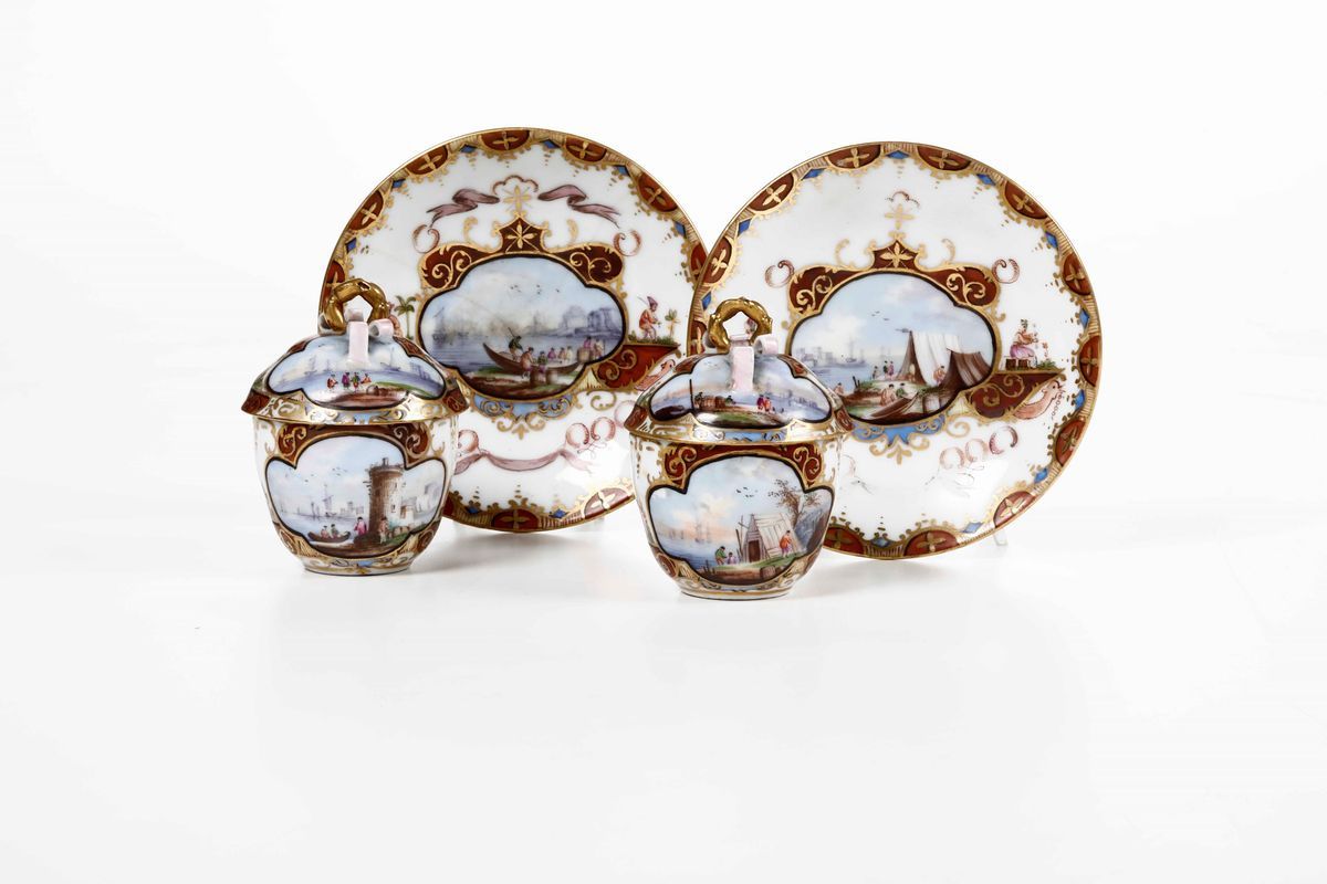 Porcellana policroma e dorata con riserve a scene di porto. Marca: pseudo spade di Meissen in blu. Altezza tazza con coperchio cm 7,3 circa; diametro piattino cm 11,1. Conservazione: 1 piattino con felature; 1 coperchio con sbeccatura al bordo