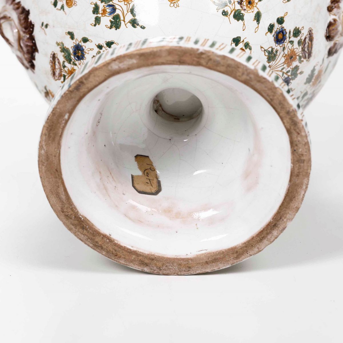 Maiolica policroma. Marca: imitazione della marca della manifattura settecentesca Oleyris, in ocra. Altezza totale cm 52. Conservazione: parte di un anello della presa di un vaso mancante