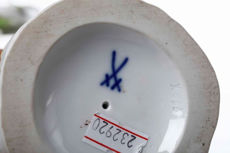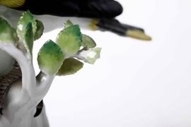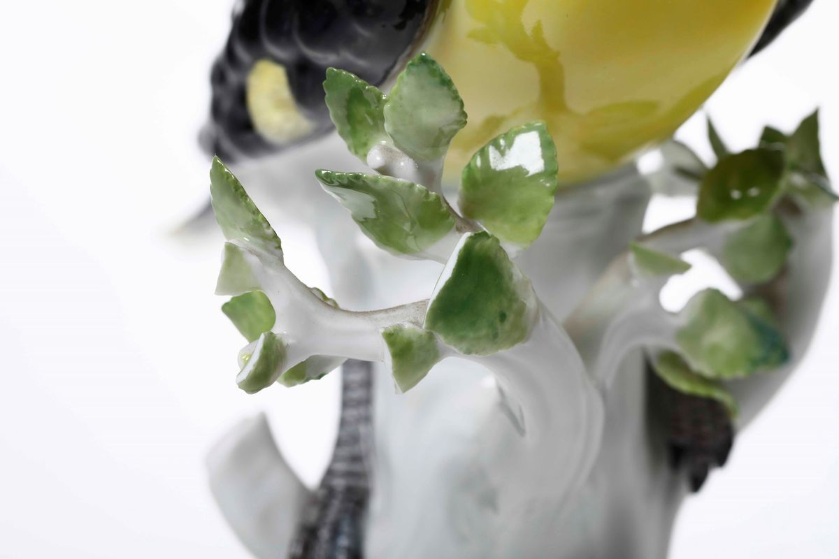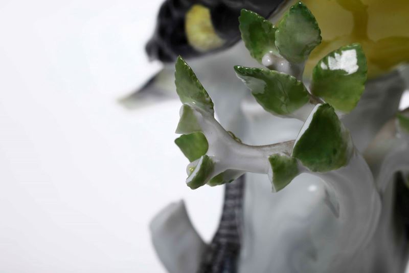 Porcellana. Marca: spade in blu; “77124“ inciso; “118X” impresso. Altezza cm 26. Conservazione: punta del becco e alcune foglie mancanti