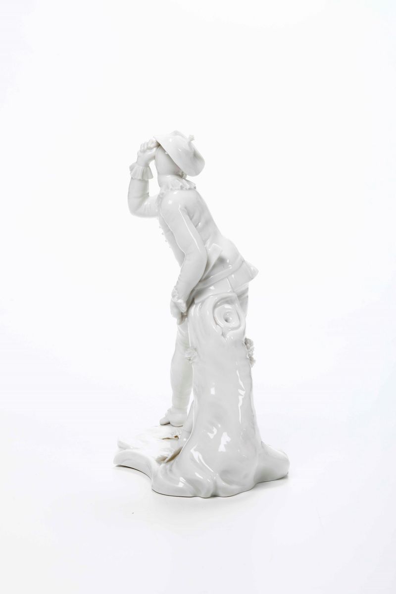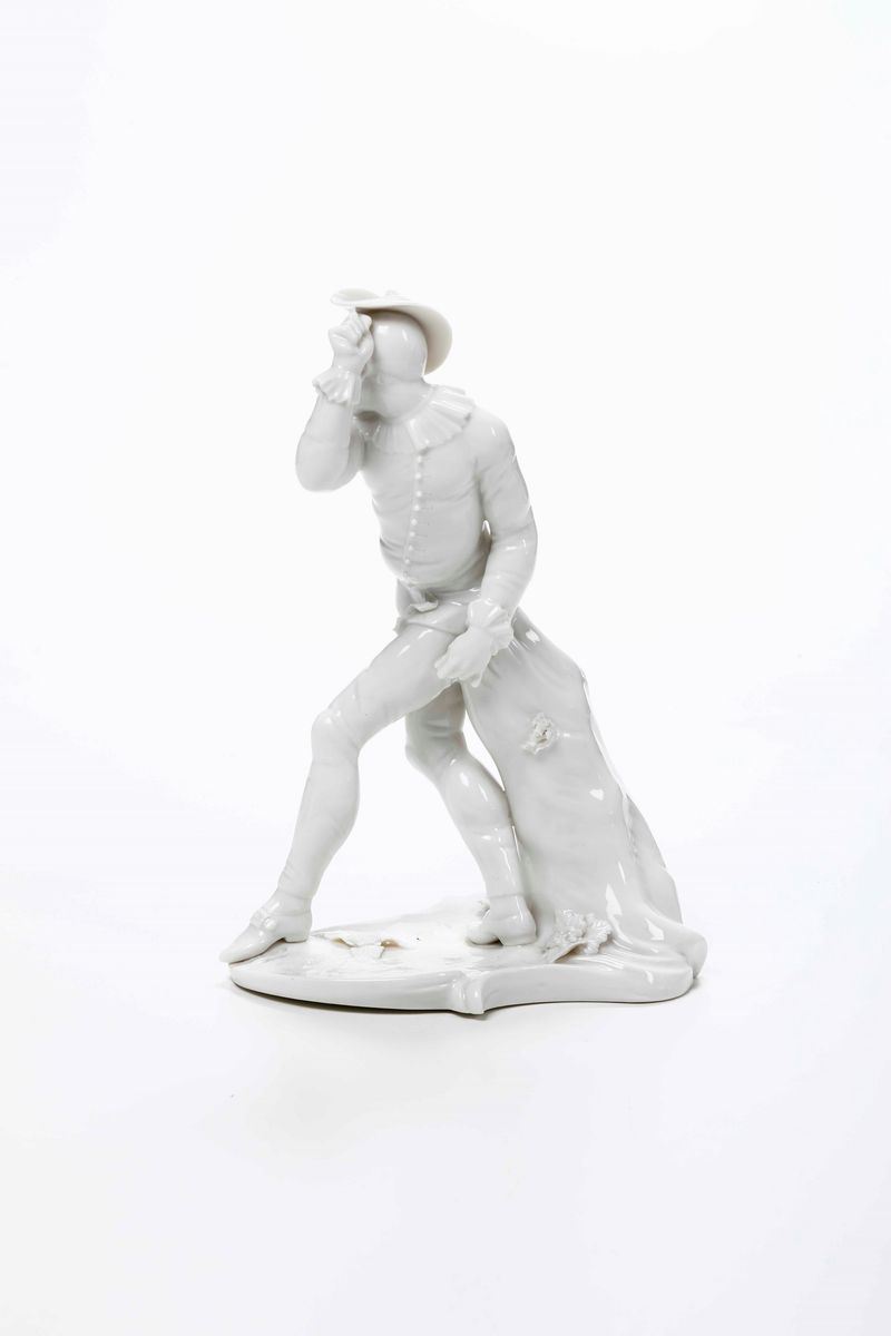 Porcellana bianca raffigurante una maschera della commedia dell'arte. Marca: scudo bavarese, “82” “0”, impressi. Altezza cm 19,5. Conservazione: ottima; insignificante sbeccatura alla tesa del cappello