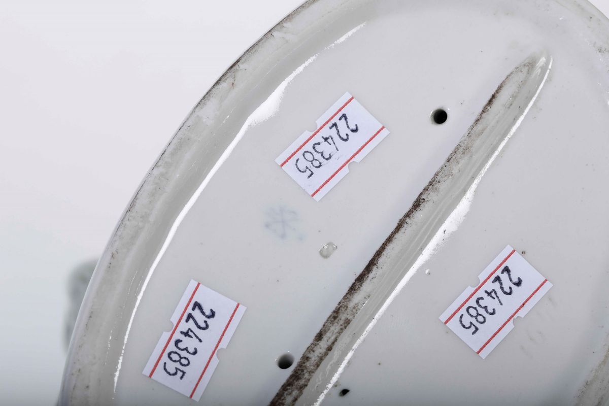 Porcellana policroma. Marca: simbolo grafico della manifattura con croce e lettere “ENS” in blu. Altezza cm 33. Conservazione: ottima