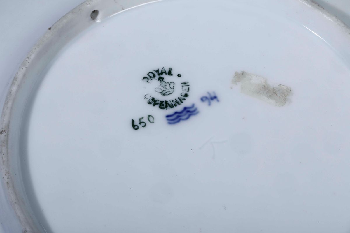 Porcellana policroma. Marca: “Royal Copenhagen” con corona al centro, in verde; onde in blu; numeri diversi. Diametro cm 20 circa. Conservazione: ottima