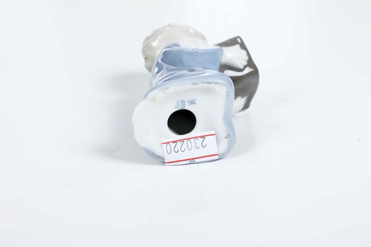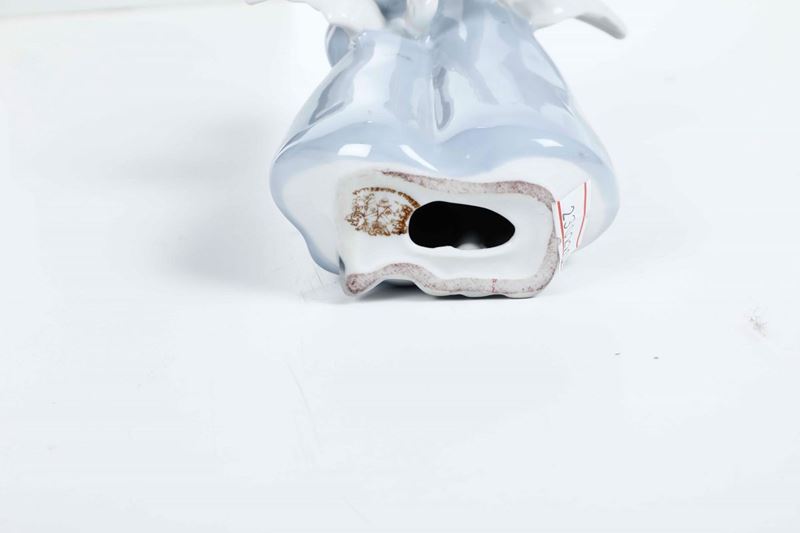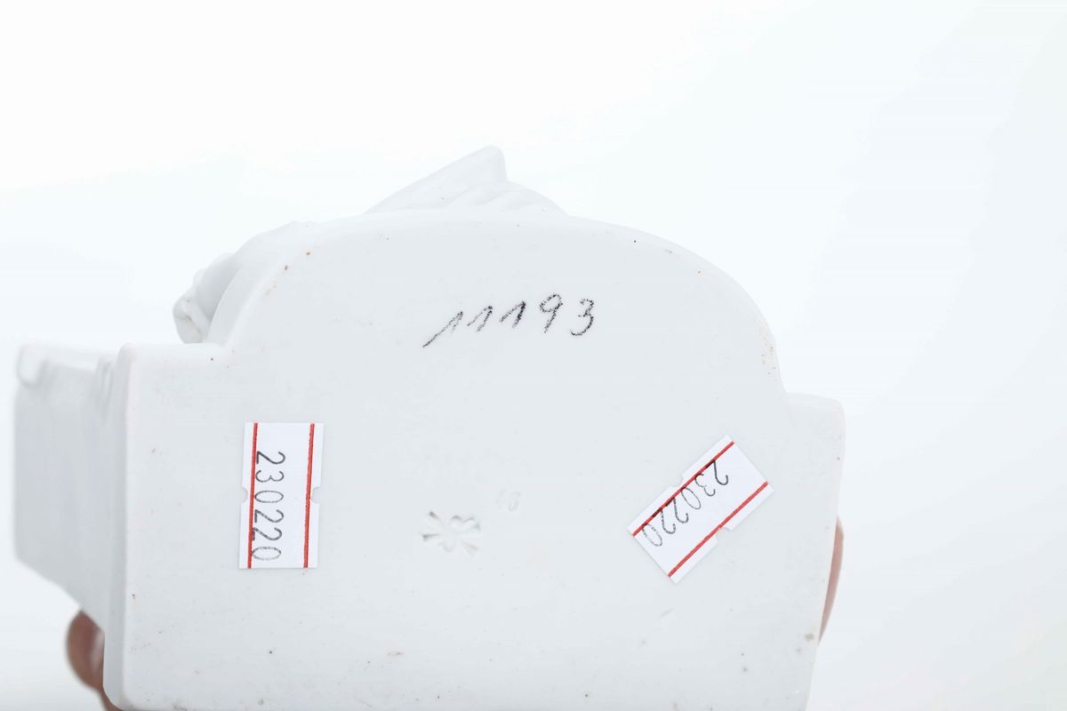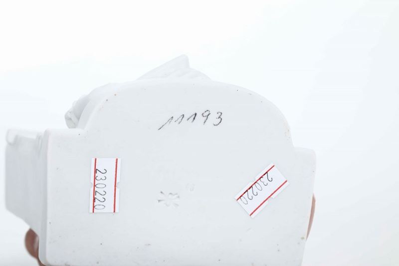 Porcellana biscuit e smaltata. Marca: su 2 figurine simbolo grafico della manifattura in bruno e rispettivamente N coronata in blu; sull'orologio simbolo della manifattura impresso. Altezza massima cm 18,2. Conservazione: ottima