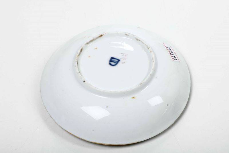 Porcellana. Marca: scudo in blu; numeri e lettere in porpora. Diametro cm 13,3. Conservazione: usure all'oro