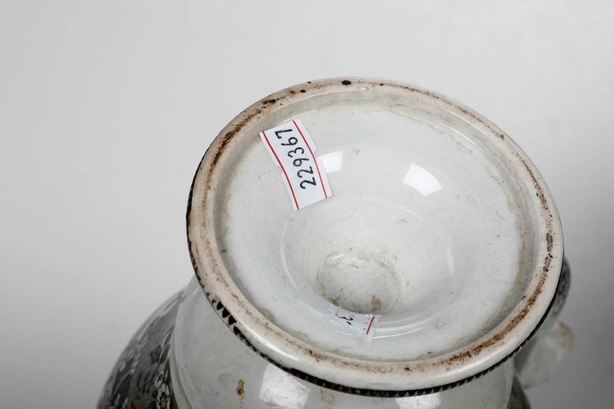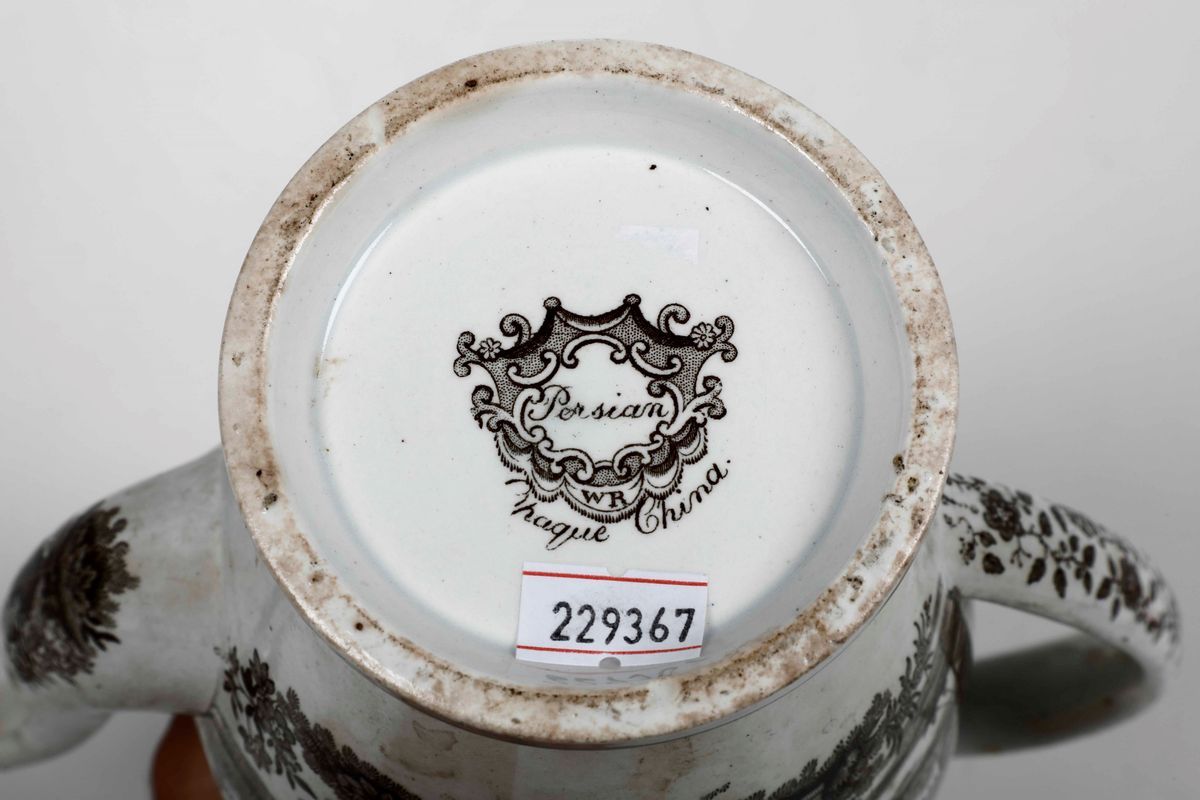 Terraglia decorata in monocromia color bruno. Marca: cartiglio con Persian Opaque China e WR. Altezza massima cm 23 circa. Conservazione: craquelures