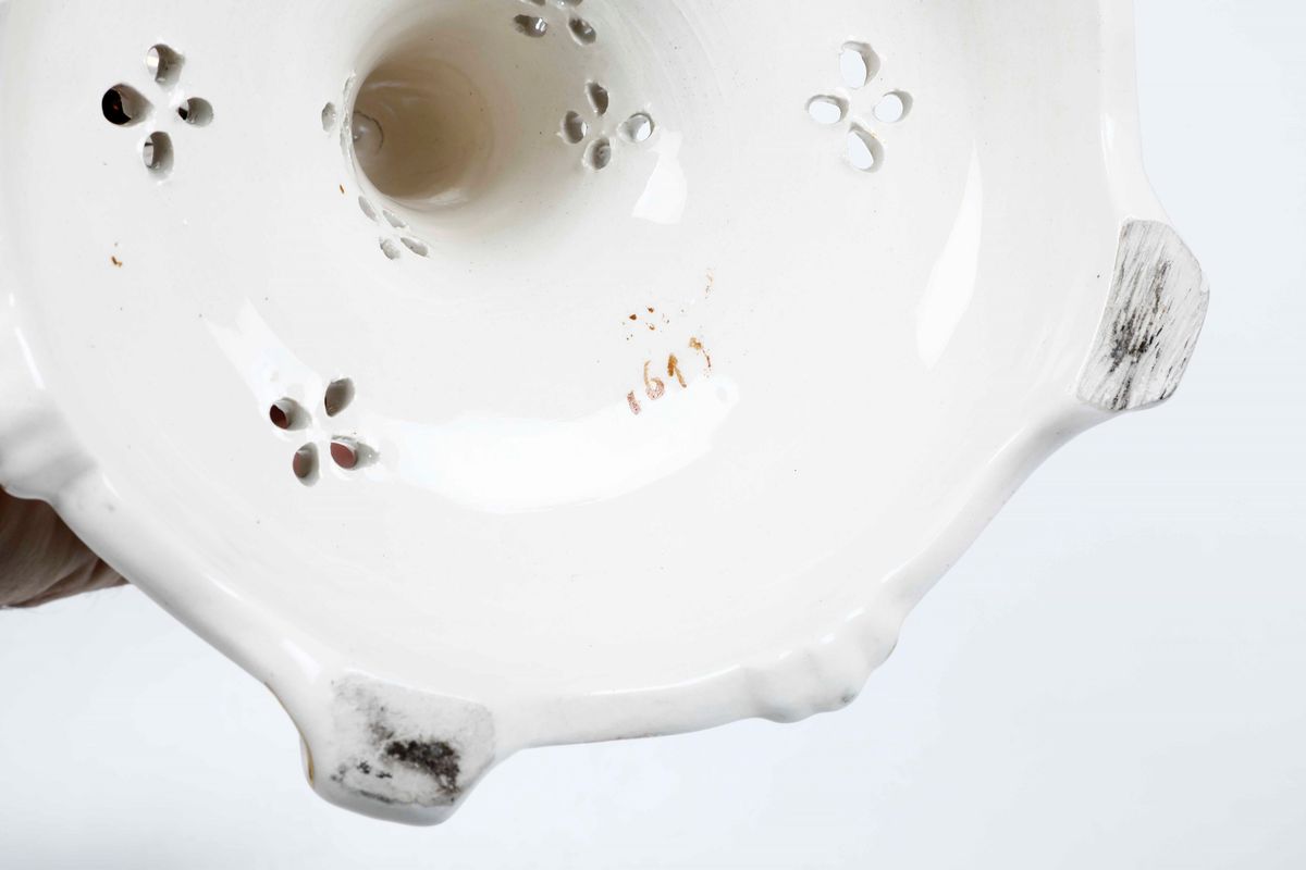 Porcellana con figure e motivi a rocaille in rilievo. Marca: assente; serie di numeri sbiaditi. Altezza cm 43. Conservazione: ottima; insignificanti piccoli segni di usure all'oro