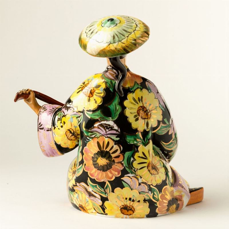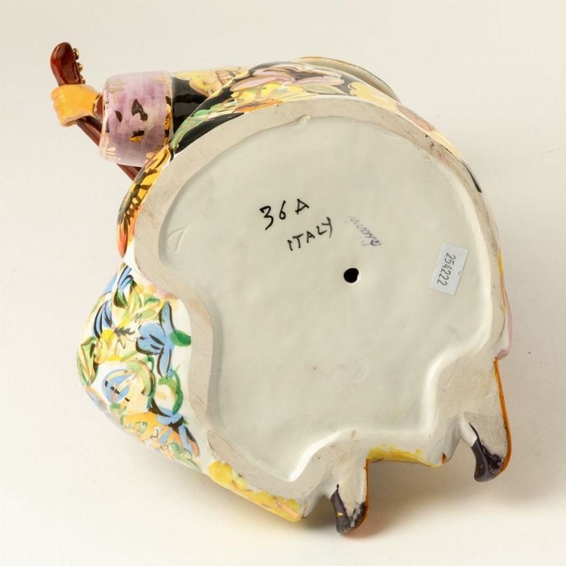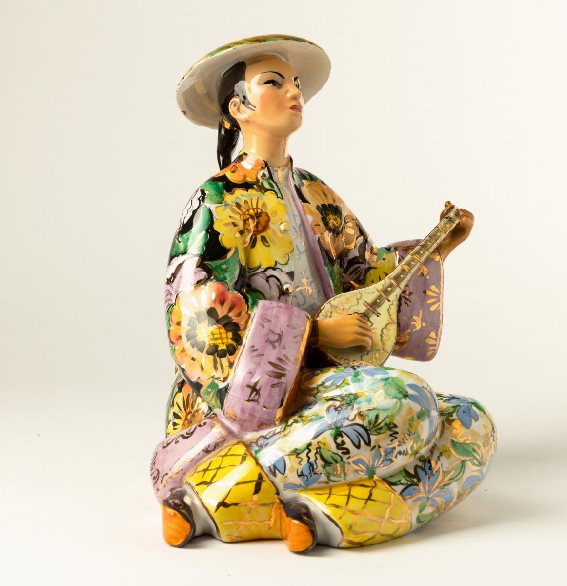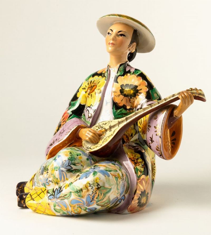 Scultura in terraglia a colaggio rappresentante musicista in costume orientale, decoro in policromia e doratura