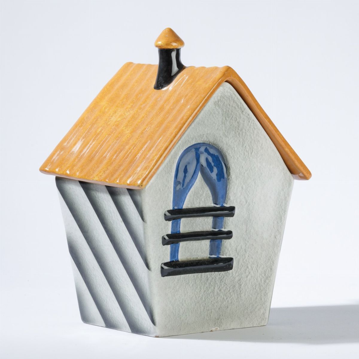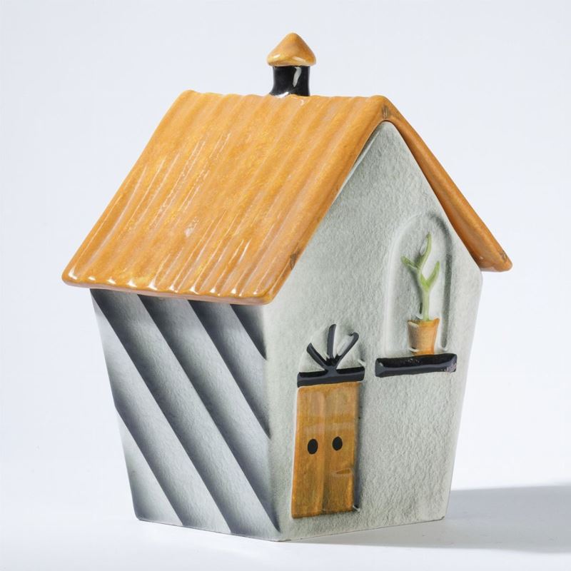 A rare terracotta box with lid in the shape of a house, hand-painted and airbrushed. H 24cm, 11x11cm. Manufacture's mark.
