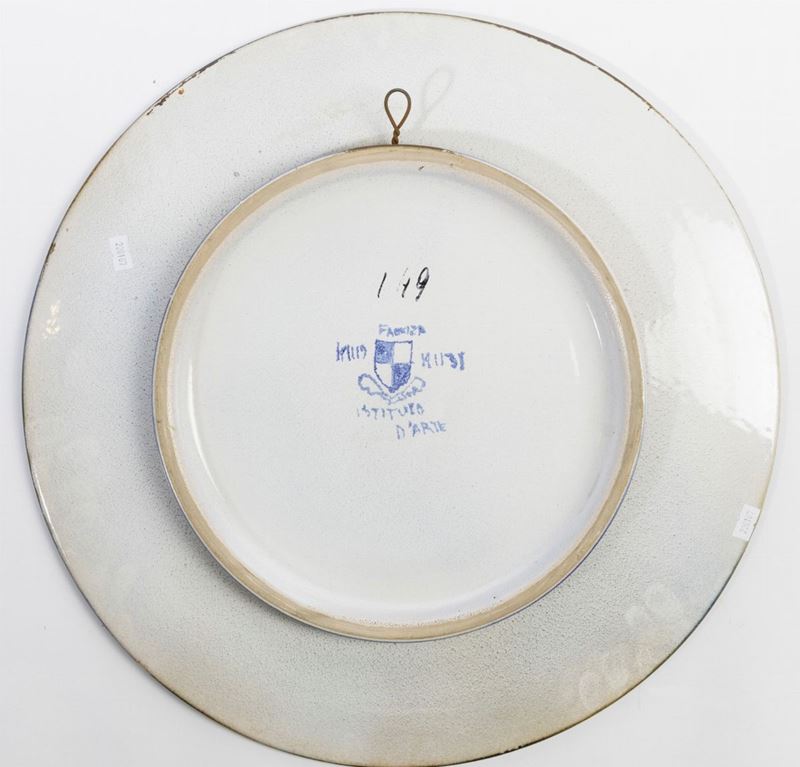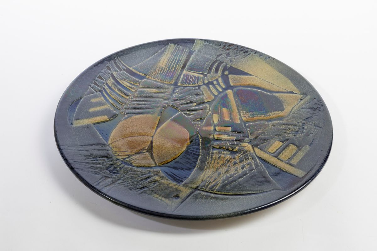 Grande piatto in terracotta con decoro astratto in maiolica a lustri.
