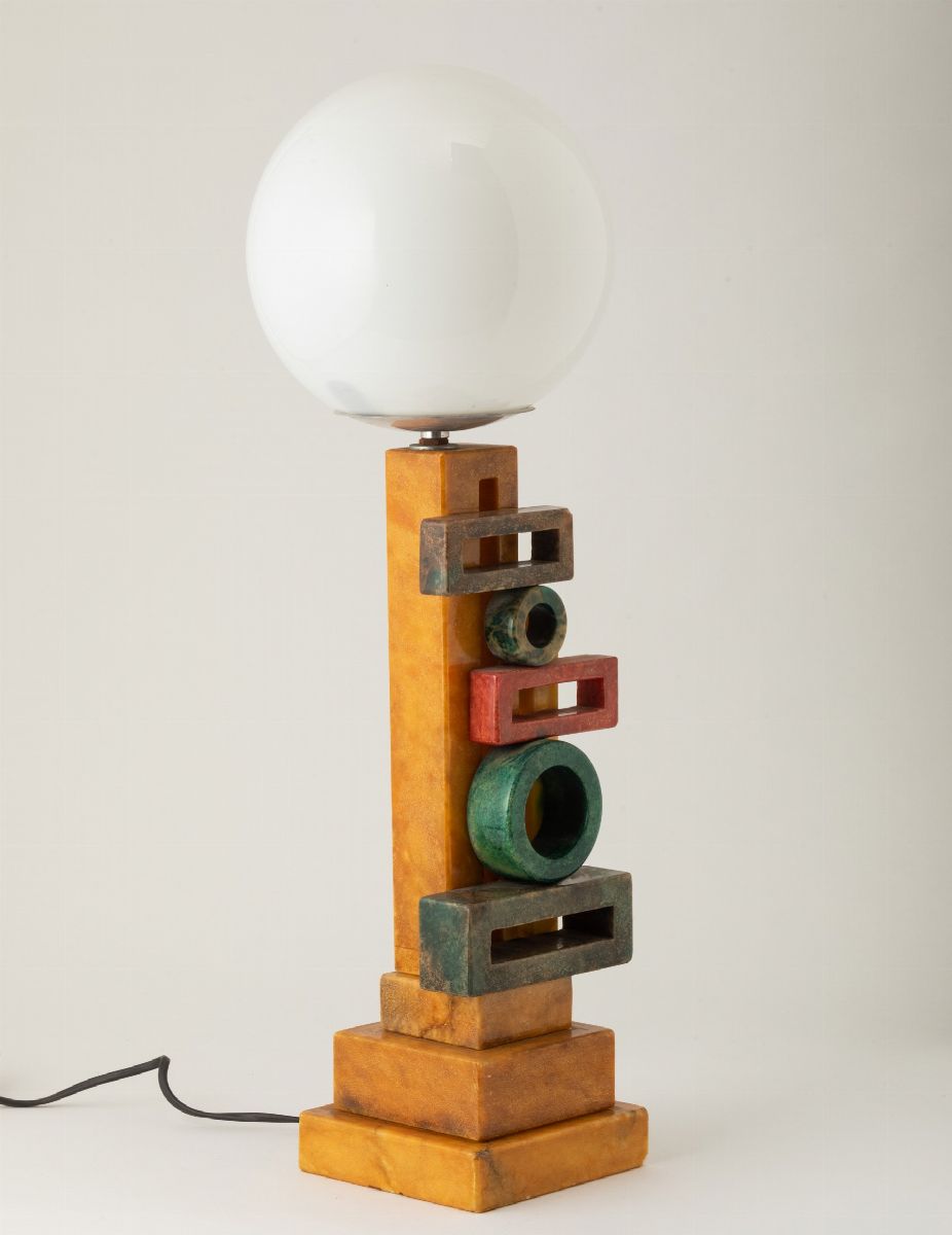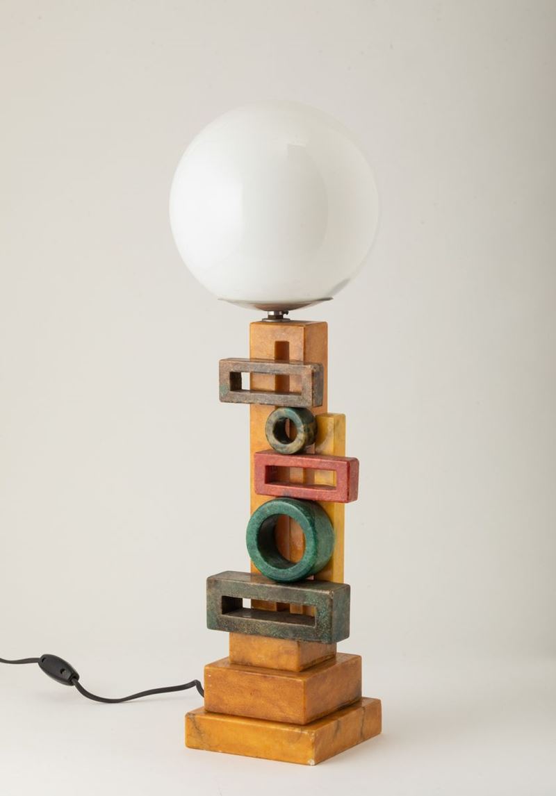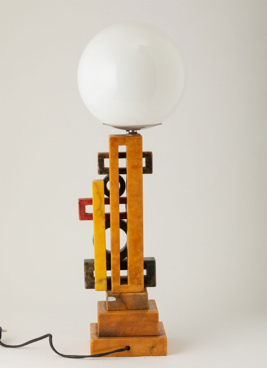 Lampada da tavolo con basamento in alabastro tinto con decoro futurista. Diffusore a sfera in vetro opalino.