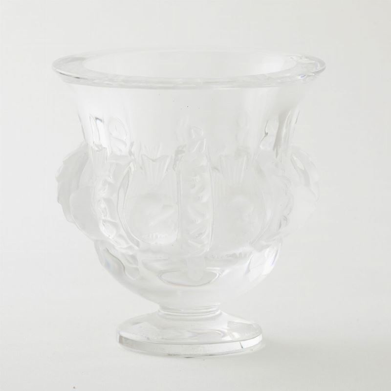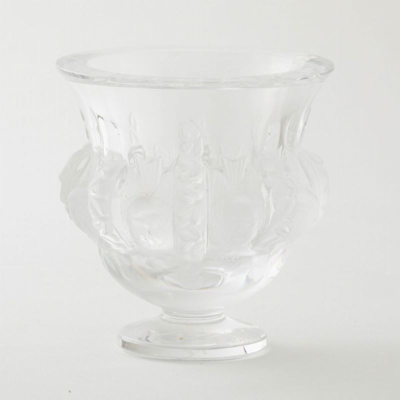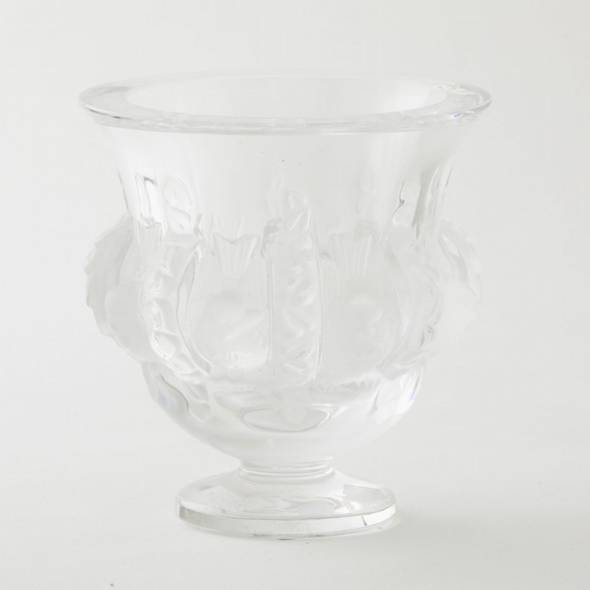 Vaso in cristallo soffiato a stampo con decoro di uccelli e ghirlande sabbiati.