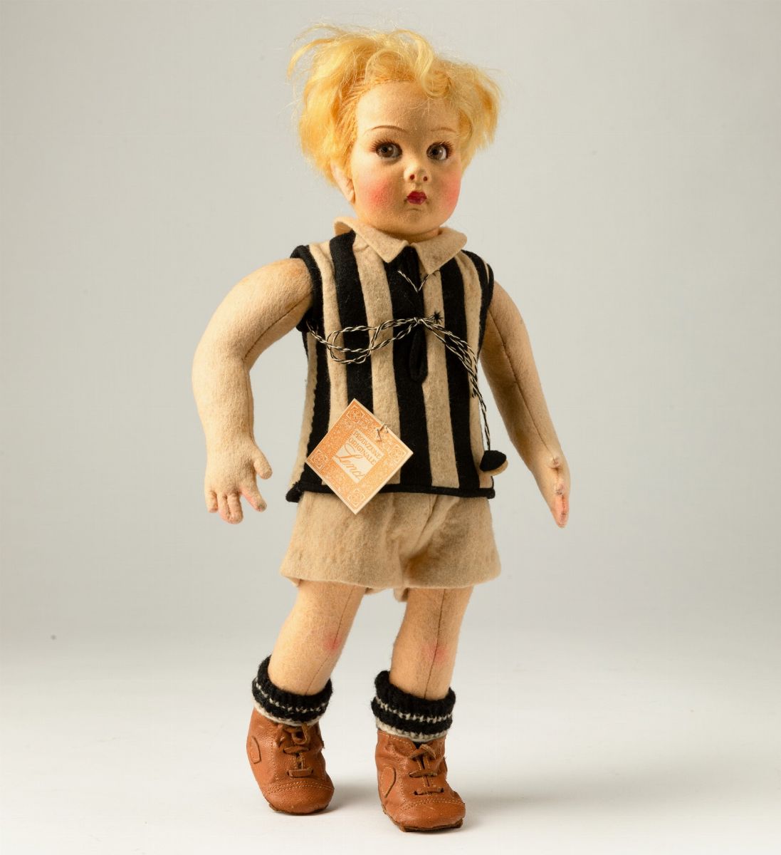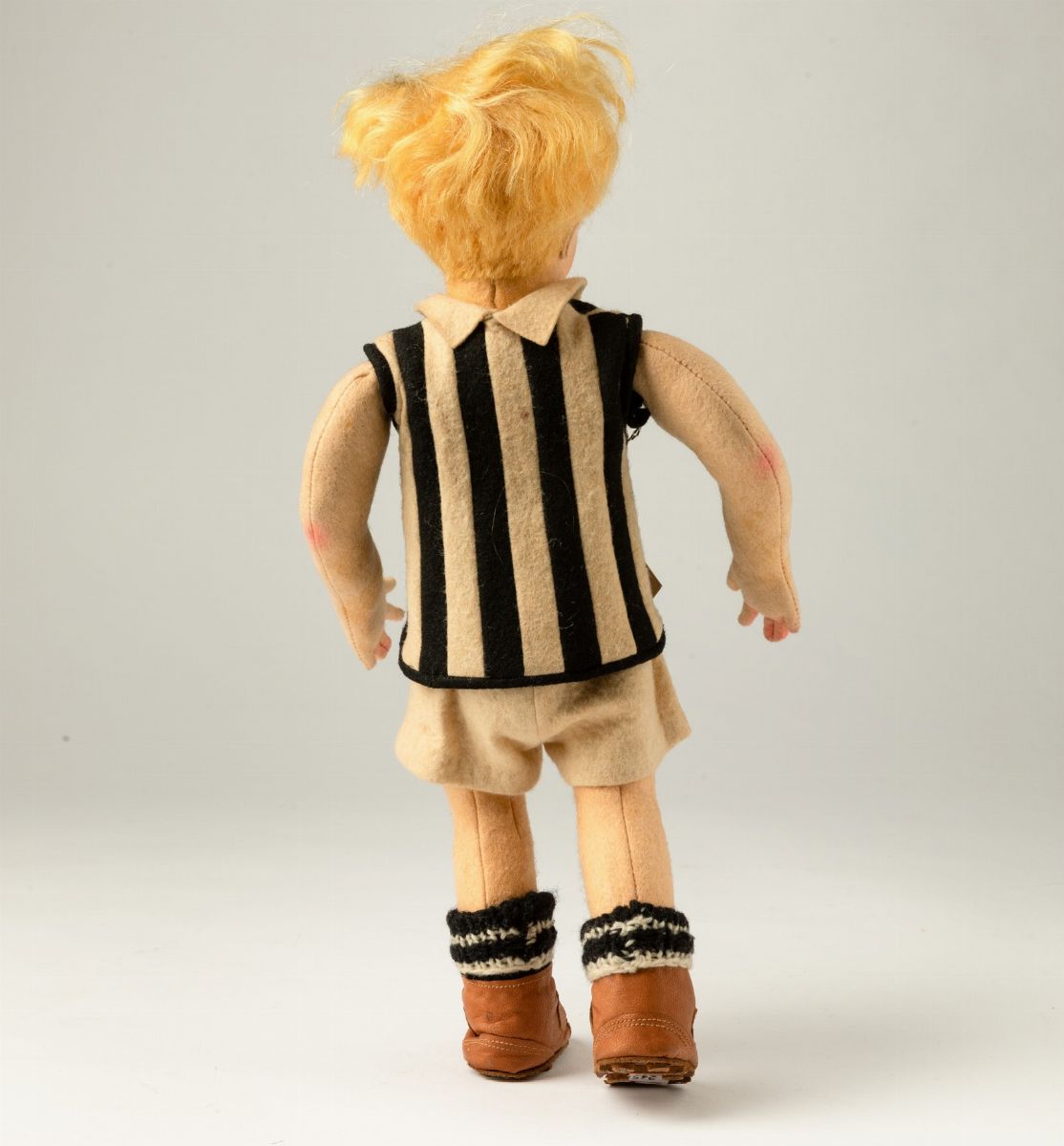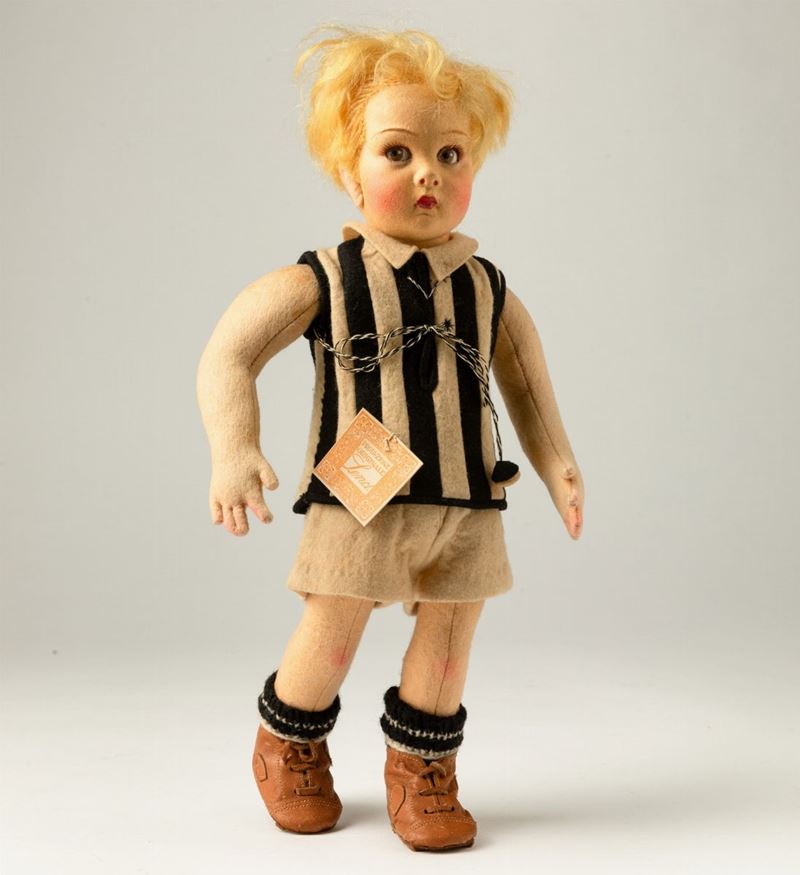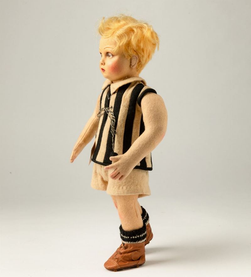 Bambolotto raffigurante giovane calciatore in pannolenci con viso decorato a mano.