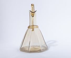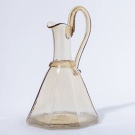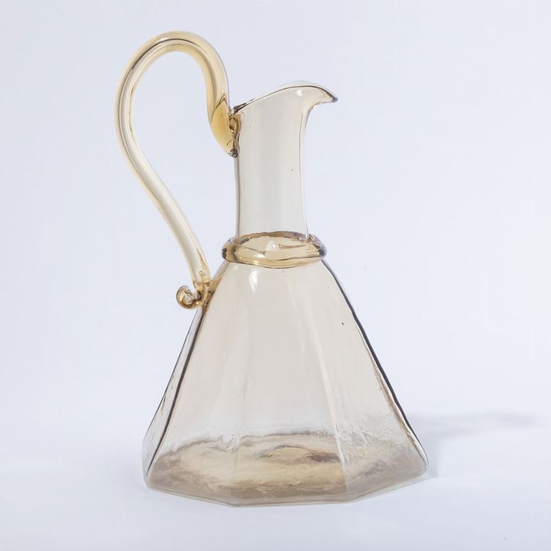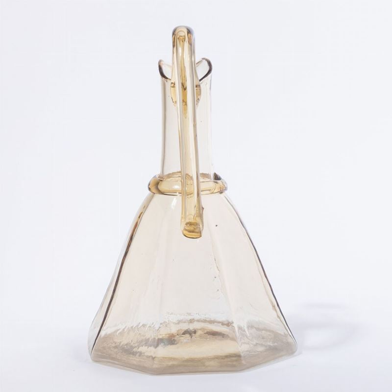 Grande caraffa in vetro soffiato paglierino a base ottagonale con cordolo e ansa applicati.