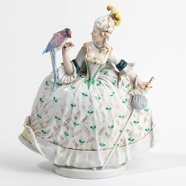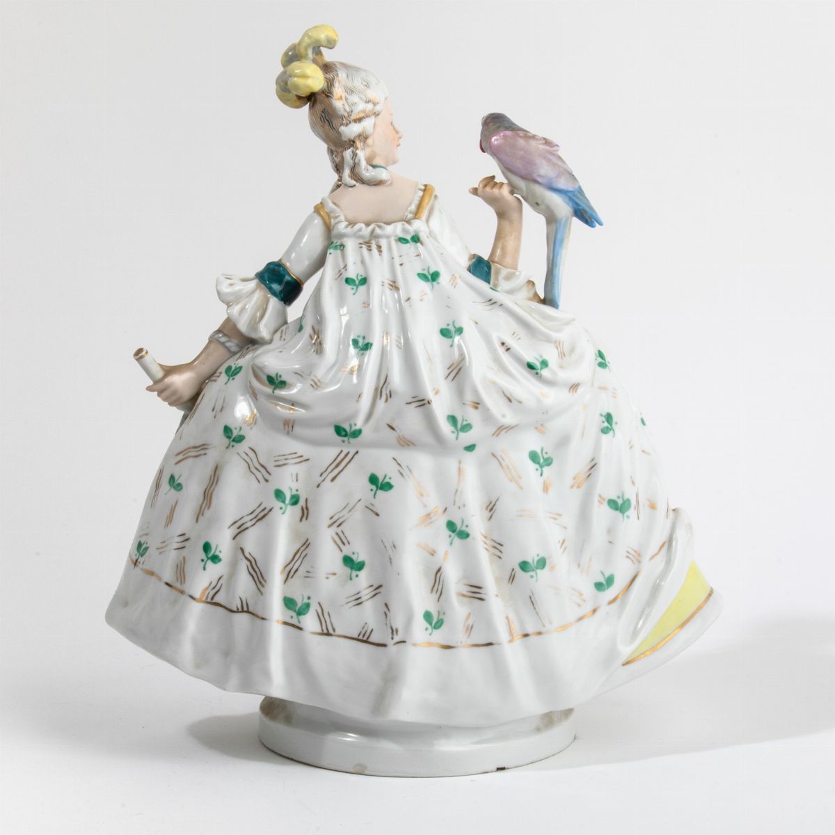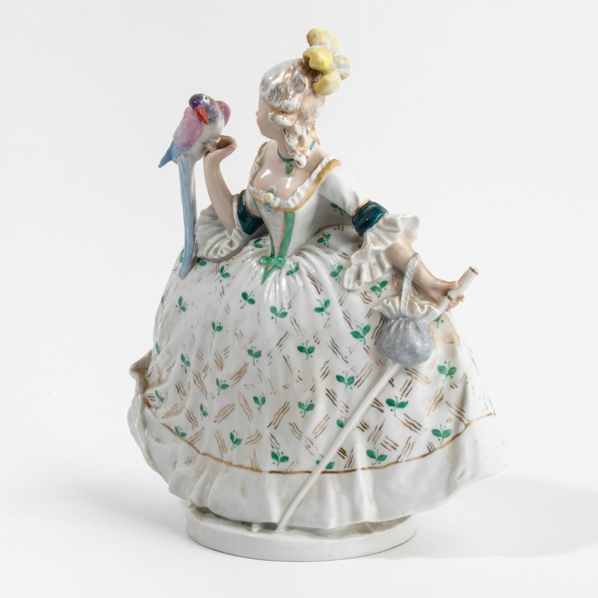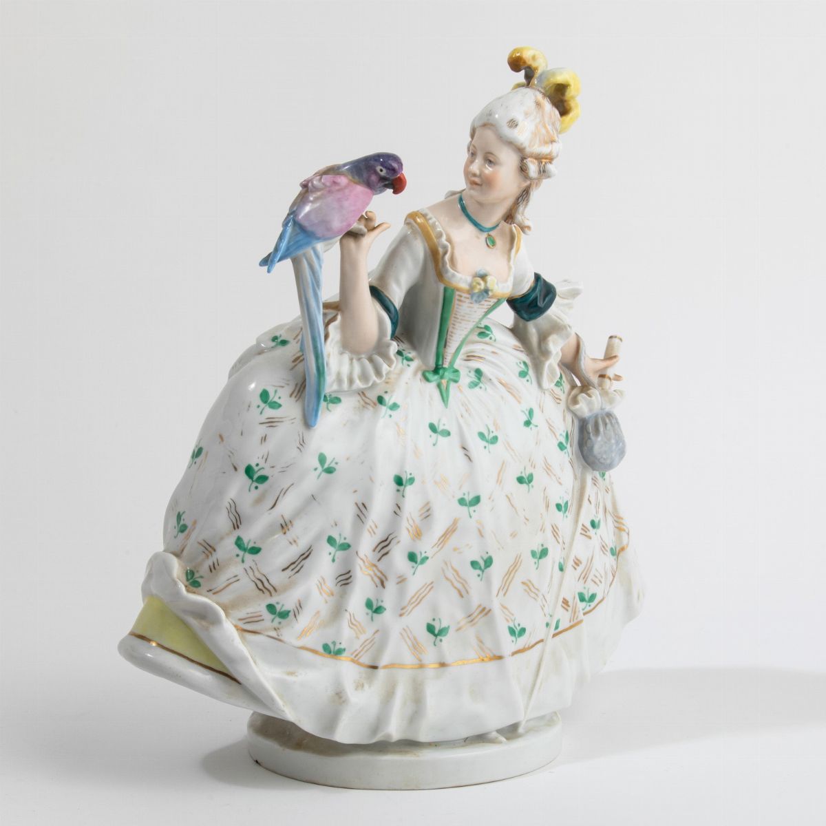 Figurina di damina con pappagallo in costume settecentesco in porcellana con decoro a smalti policromi e dorature.