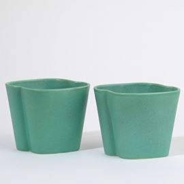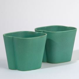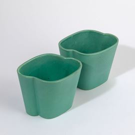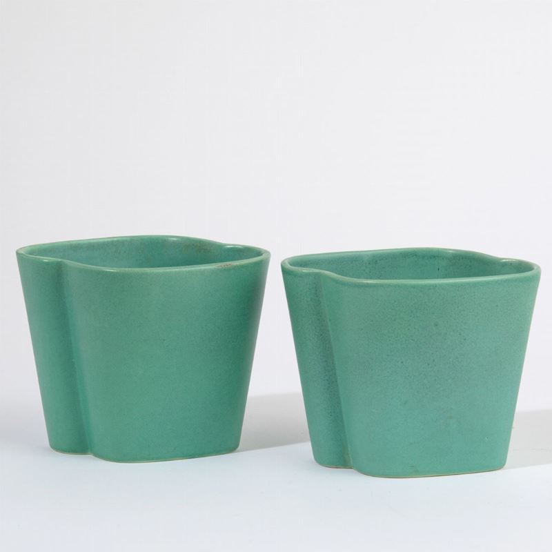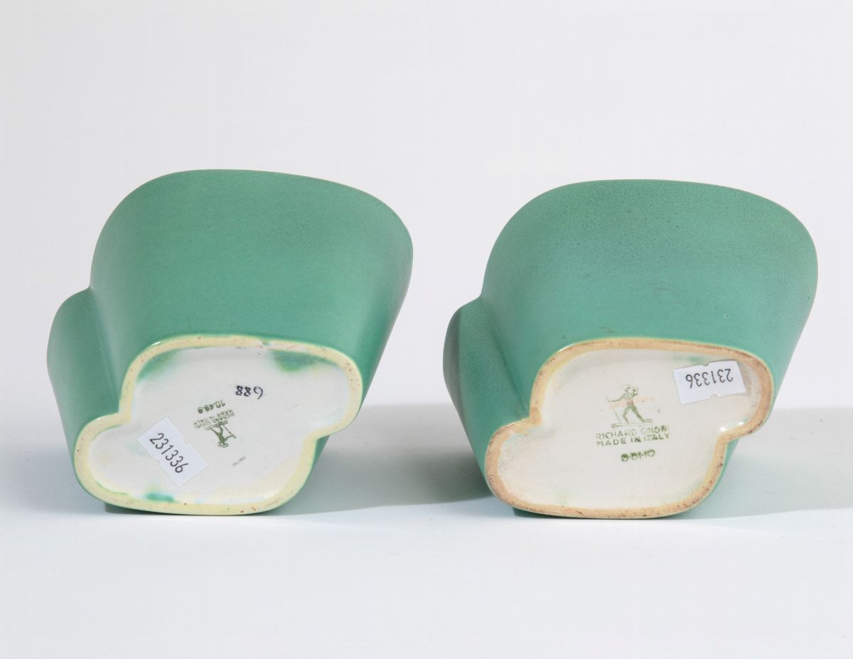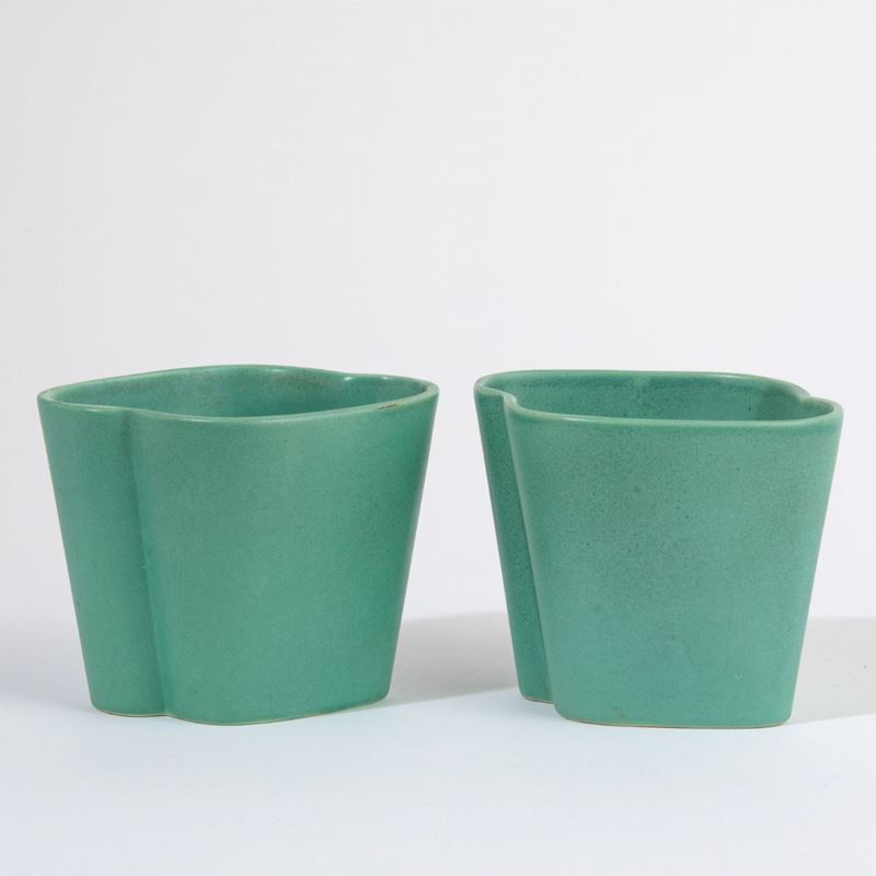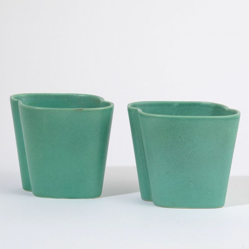 Coppia di vasi troncoconici in terraglia a colaggio con decoro di smalto verde.