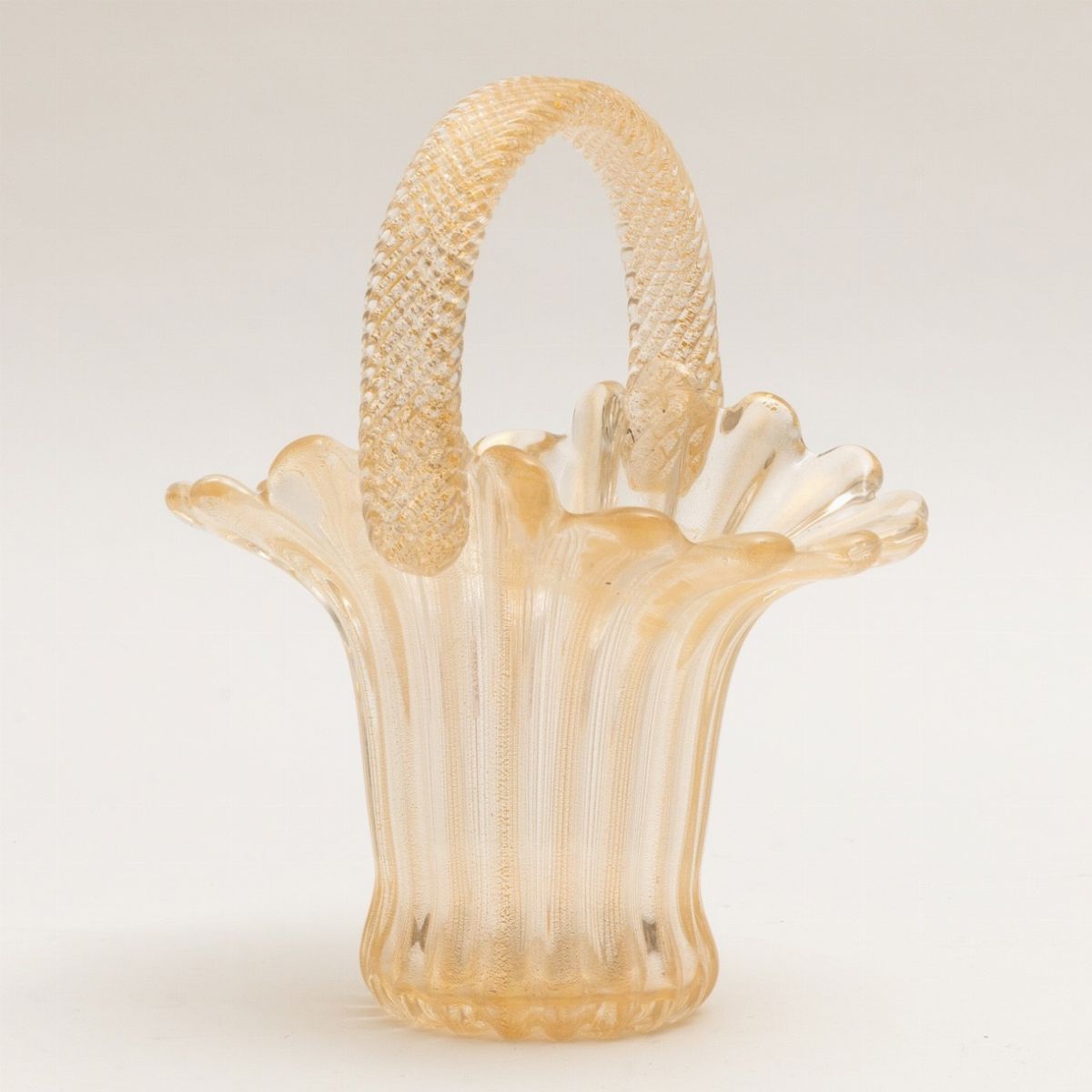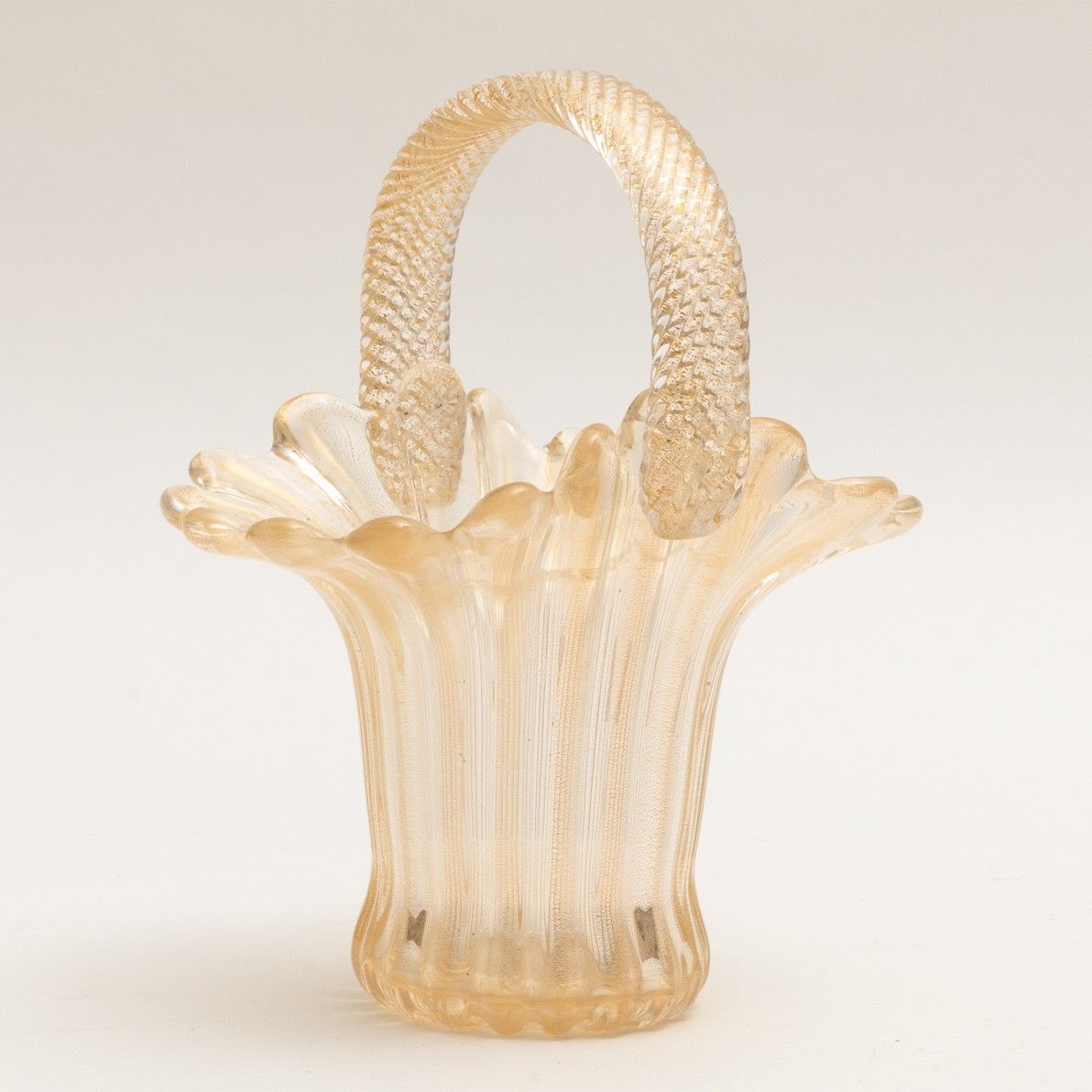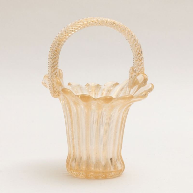 Vaso a cestino in vetro soffiato a costolature dorate e manico a torciglione.