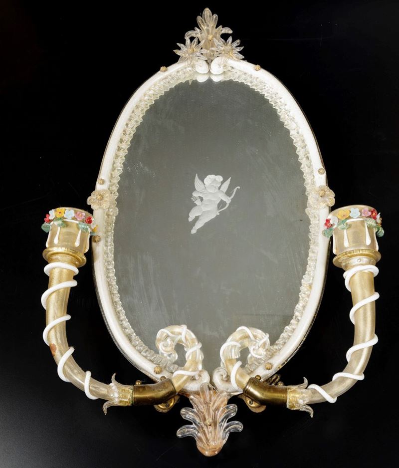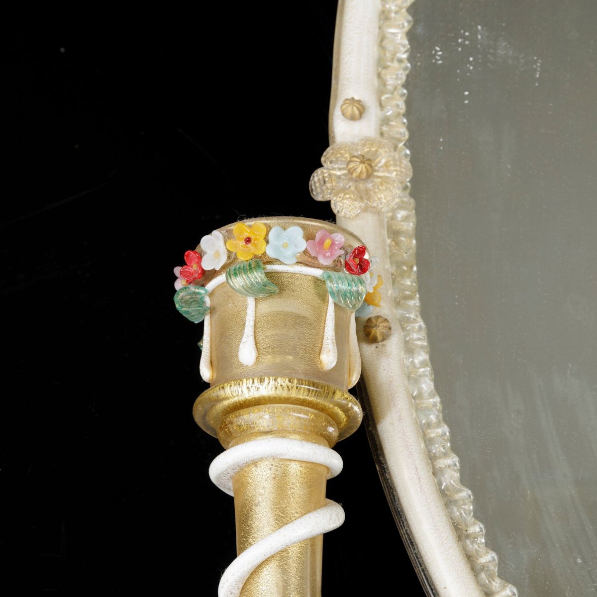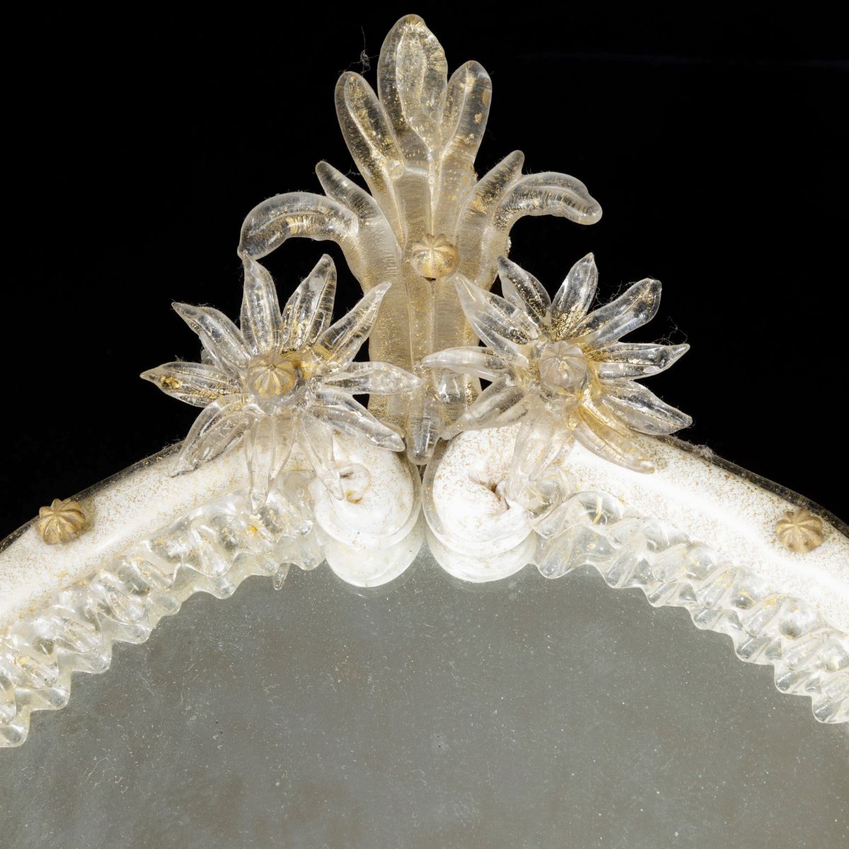 A large oval mirror in lattimo glass and gold leaf with glass paste flowers and droplets. Engraved decor on the mirror. 74x49cm