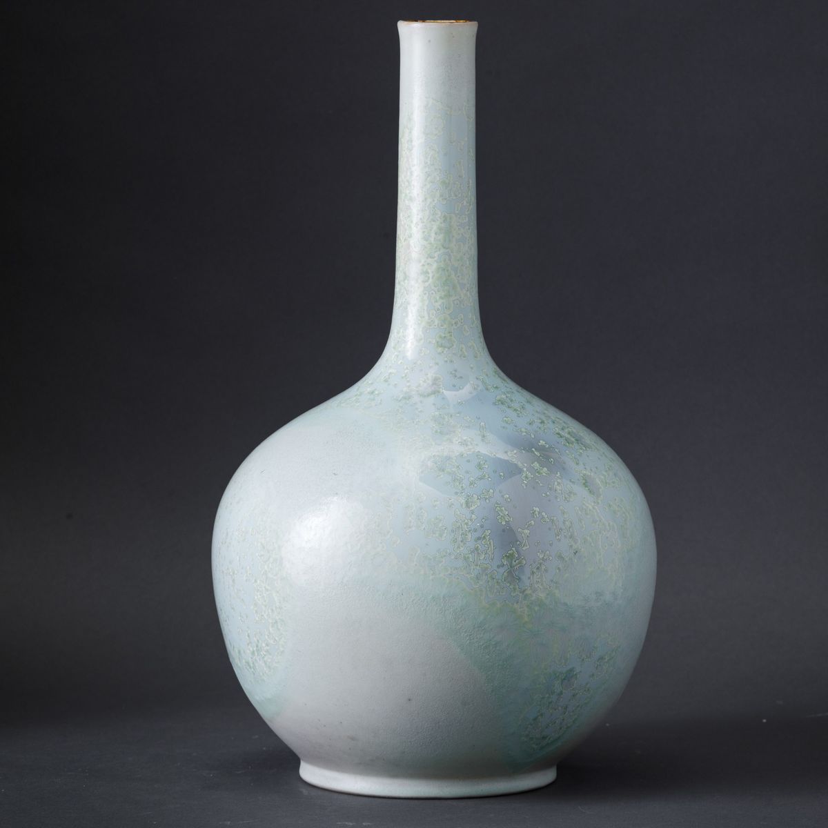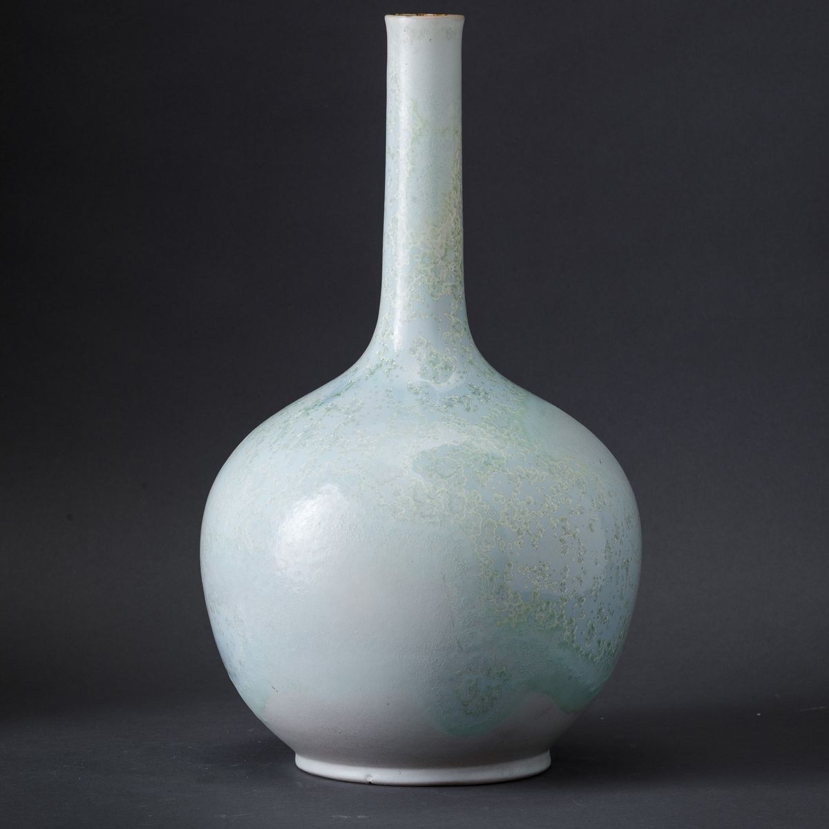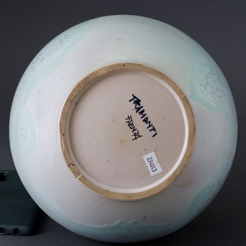 A stoneware vase with a crystallised turquoise enamel decor. H 41cm. Signed Tramonti Faenza.