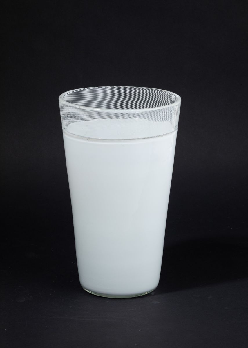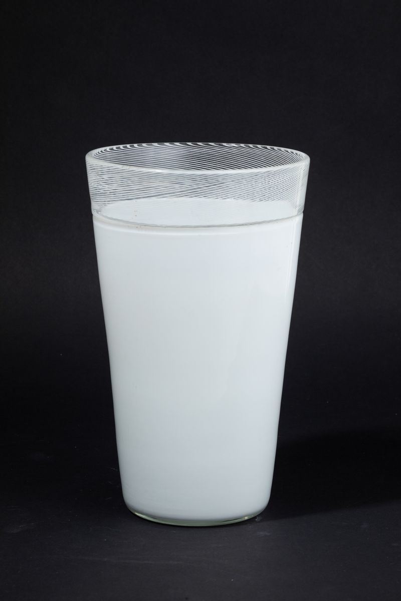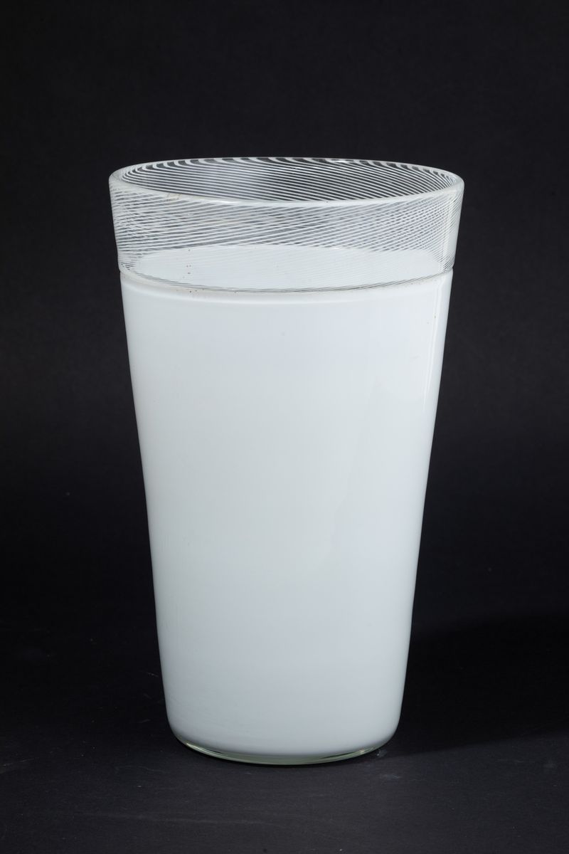 Vaso in vetro lattimo con collo in filigrana ad incalmo.