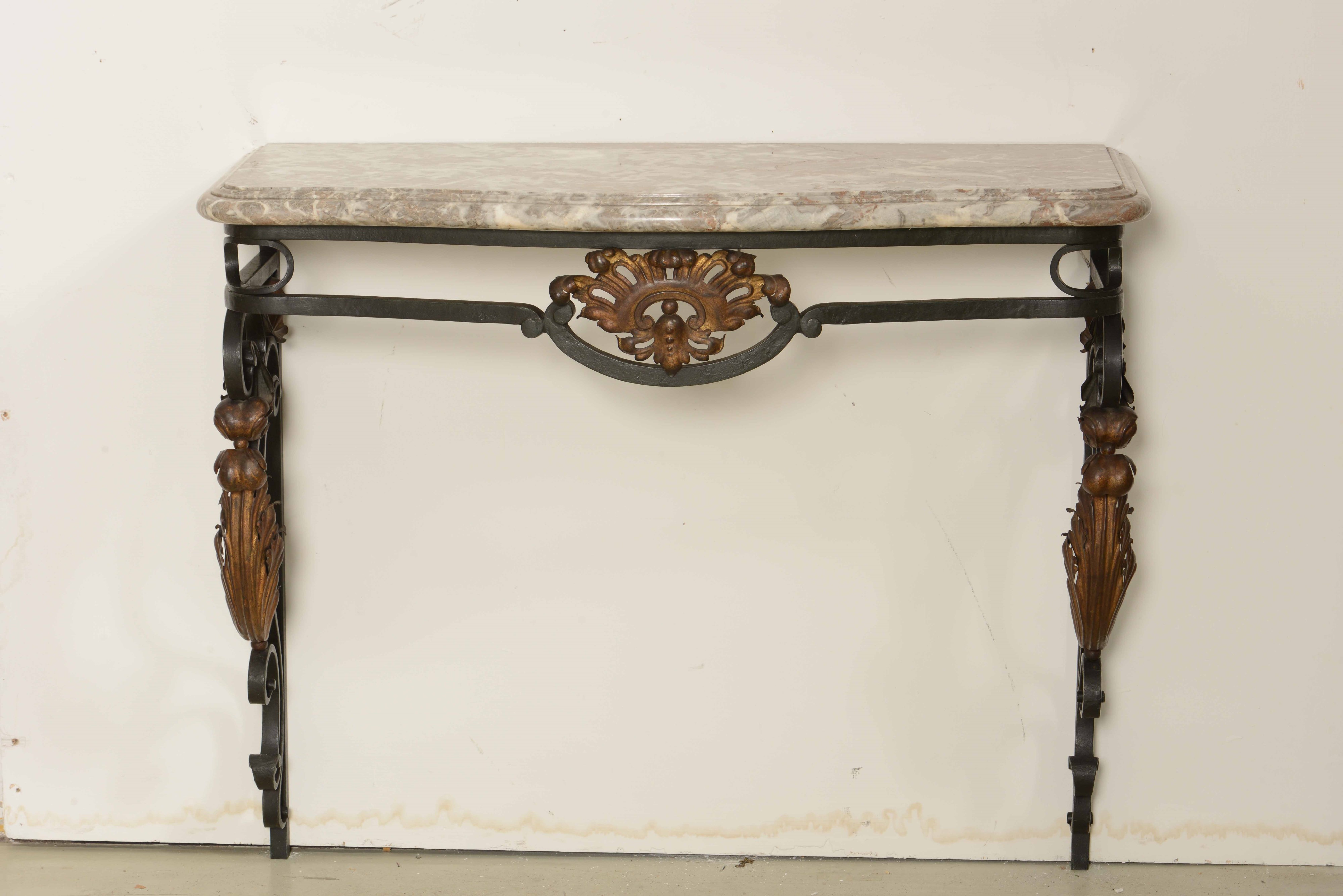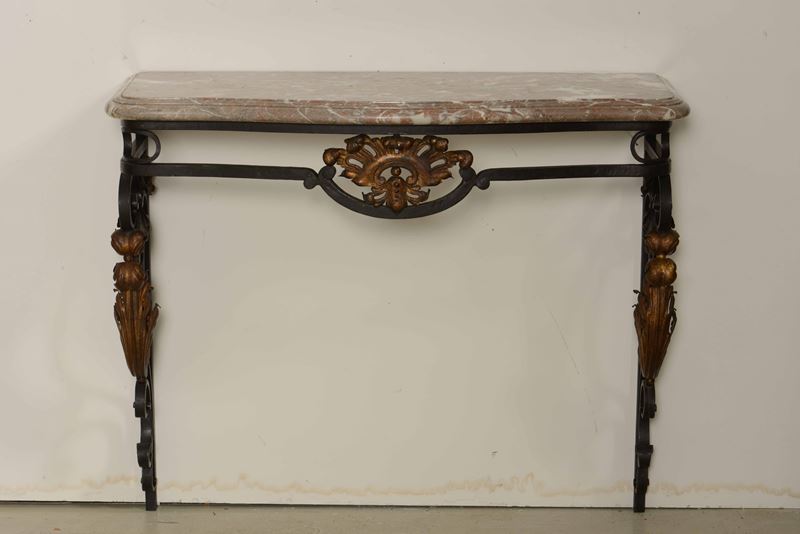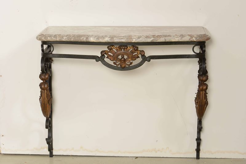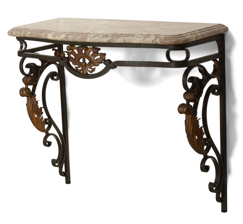 Coppia di consoles in ferro e metallo dorato, piano in marmo. Francia, Napoleone III