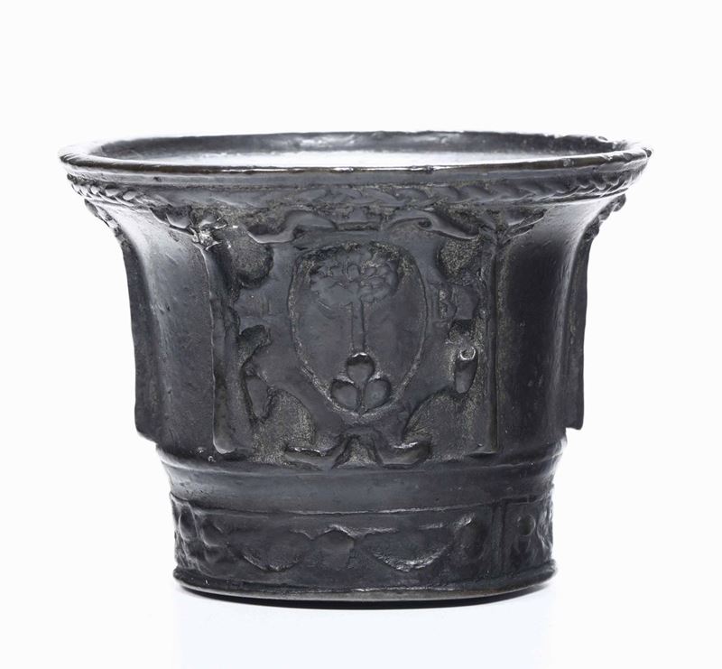 Mortaio con stemma e anello in bronzo brunito, XVII-XVIII secolo