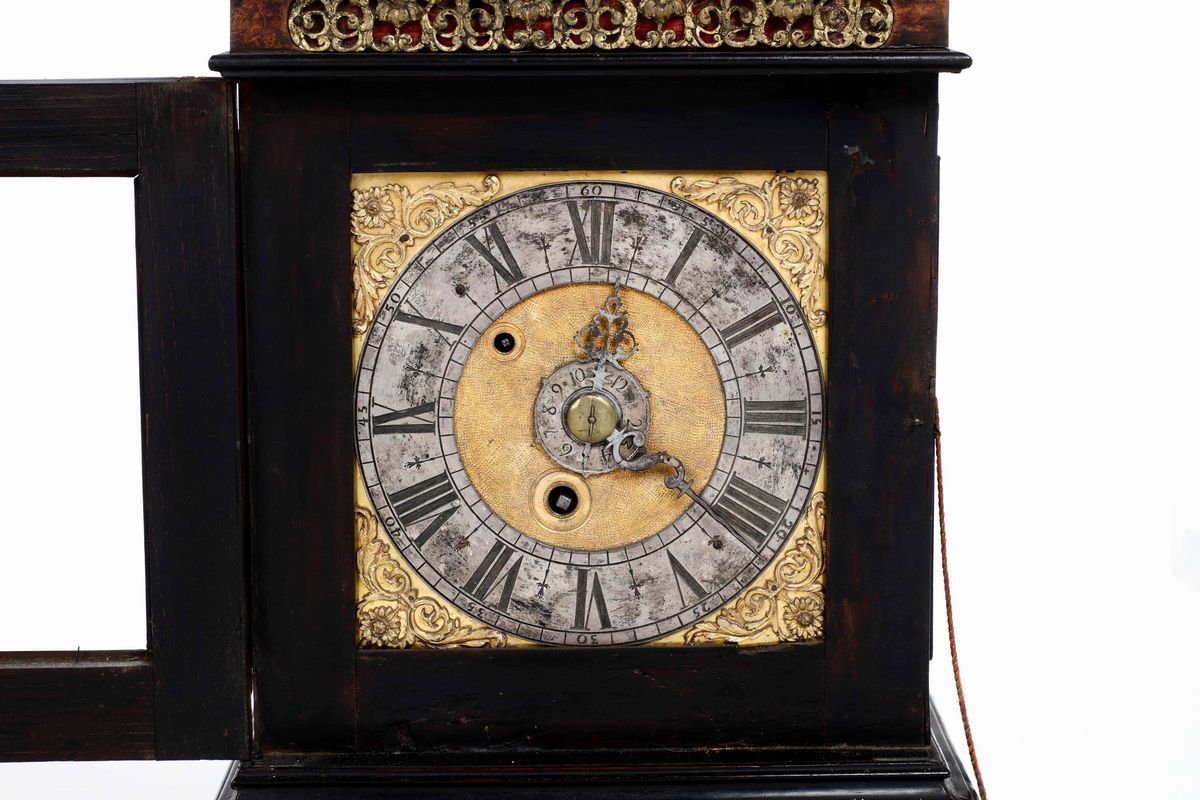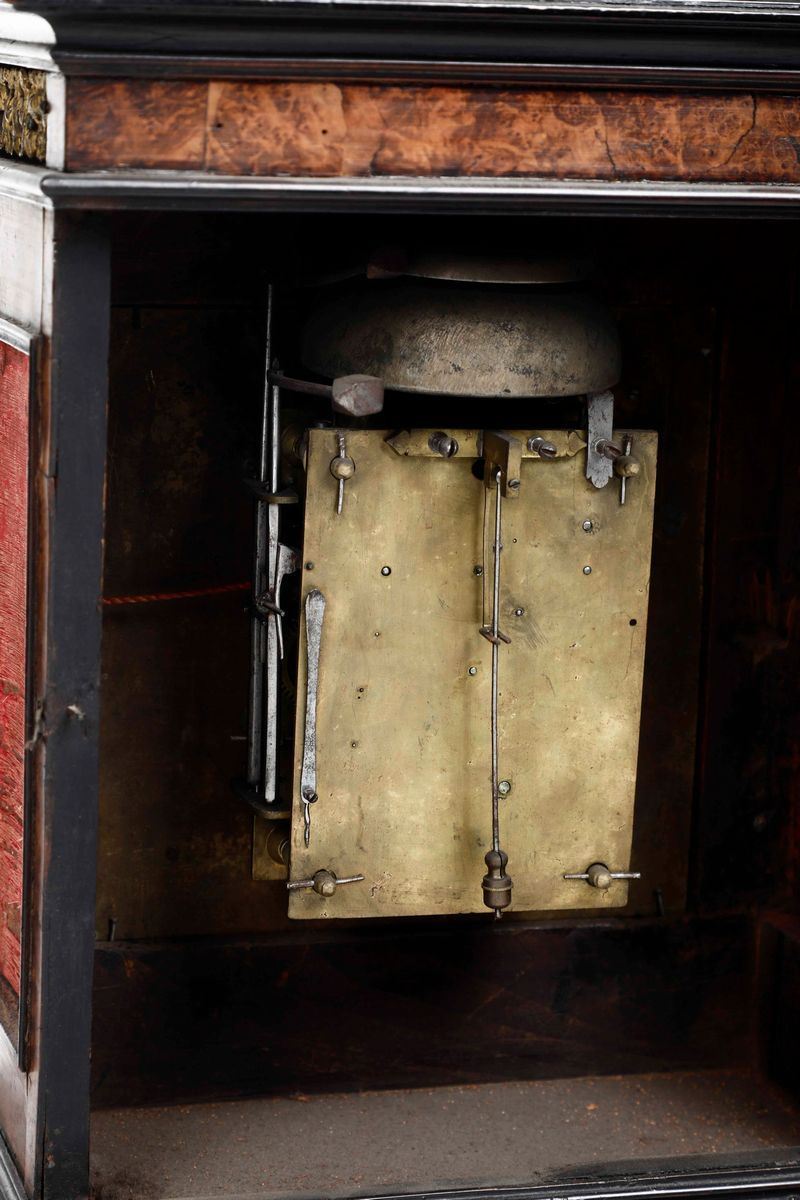 Pendola romana con cassa impiallacciata in radica e legno ebanizzato, XVIII secolo