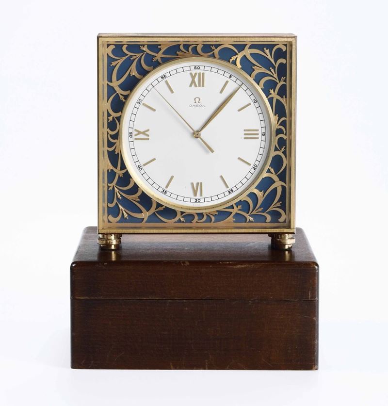 Pendoletta da tavolo in bronzo dorato Omega, con astuccio in legno
