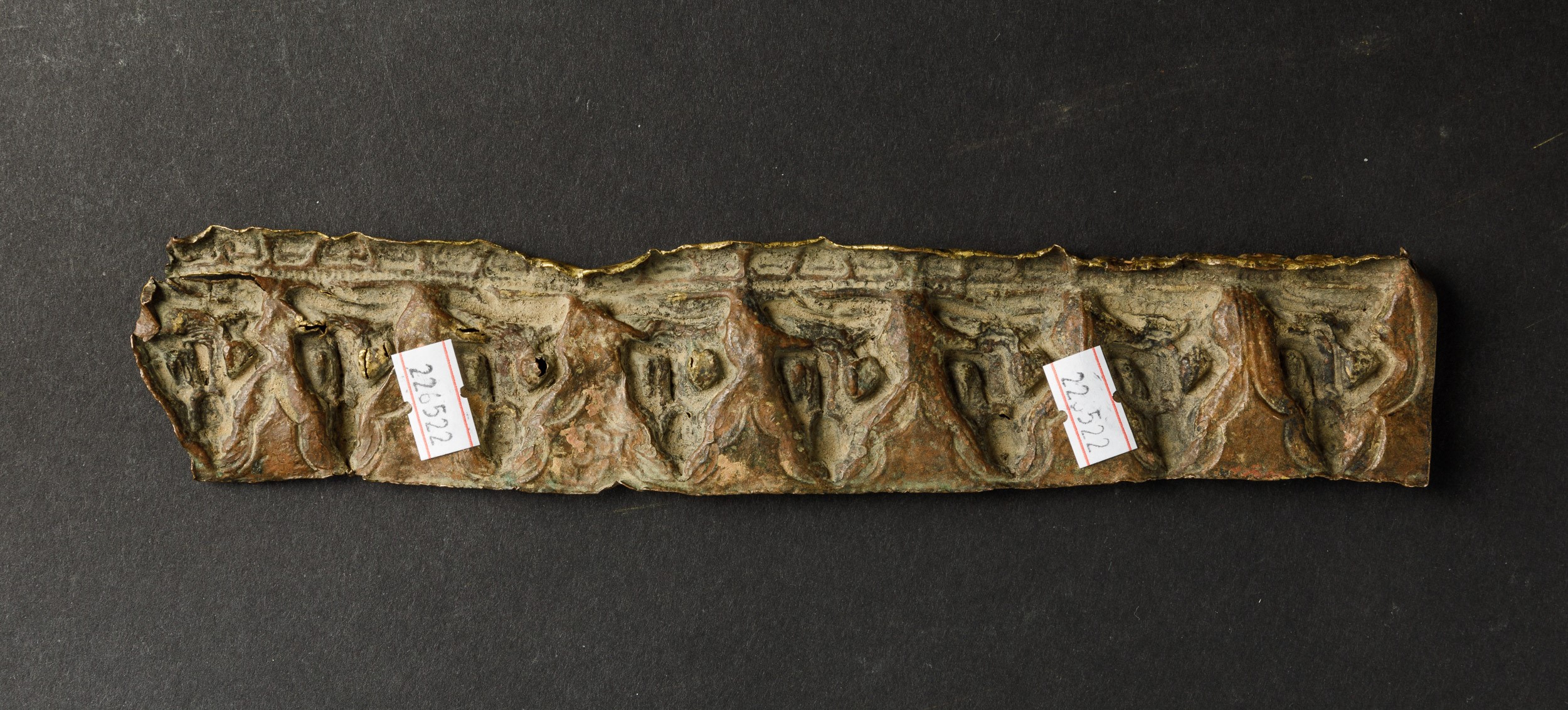 With figures of Buddhas sitting on lotus flowers. Partially gilt bronze with traces of polychromy.