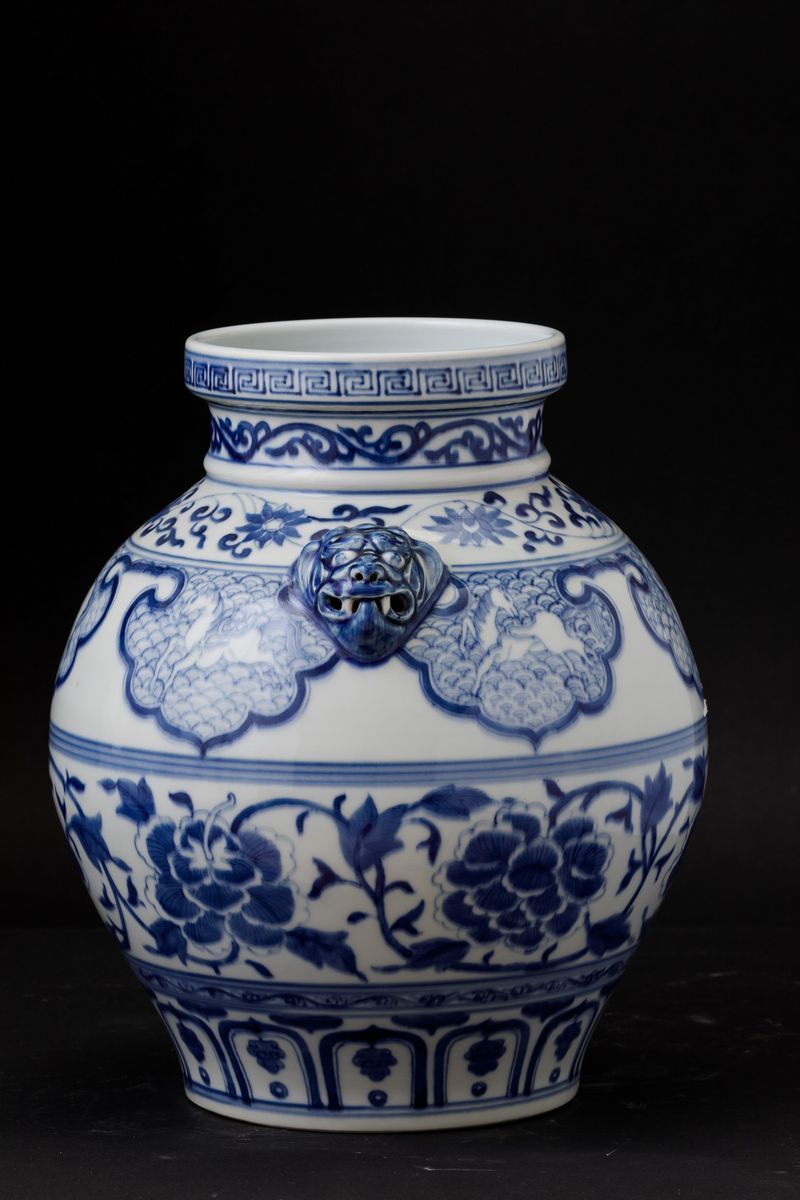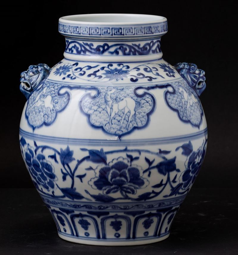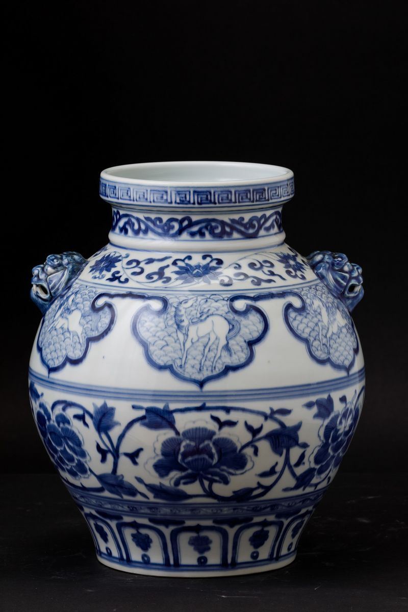 Blue and white porcelain with floral decors, horses and mascarons