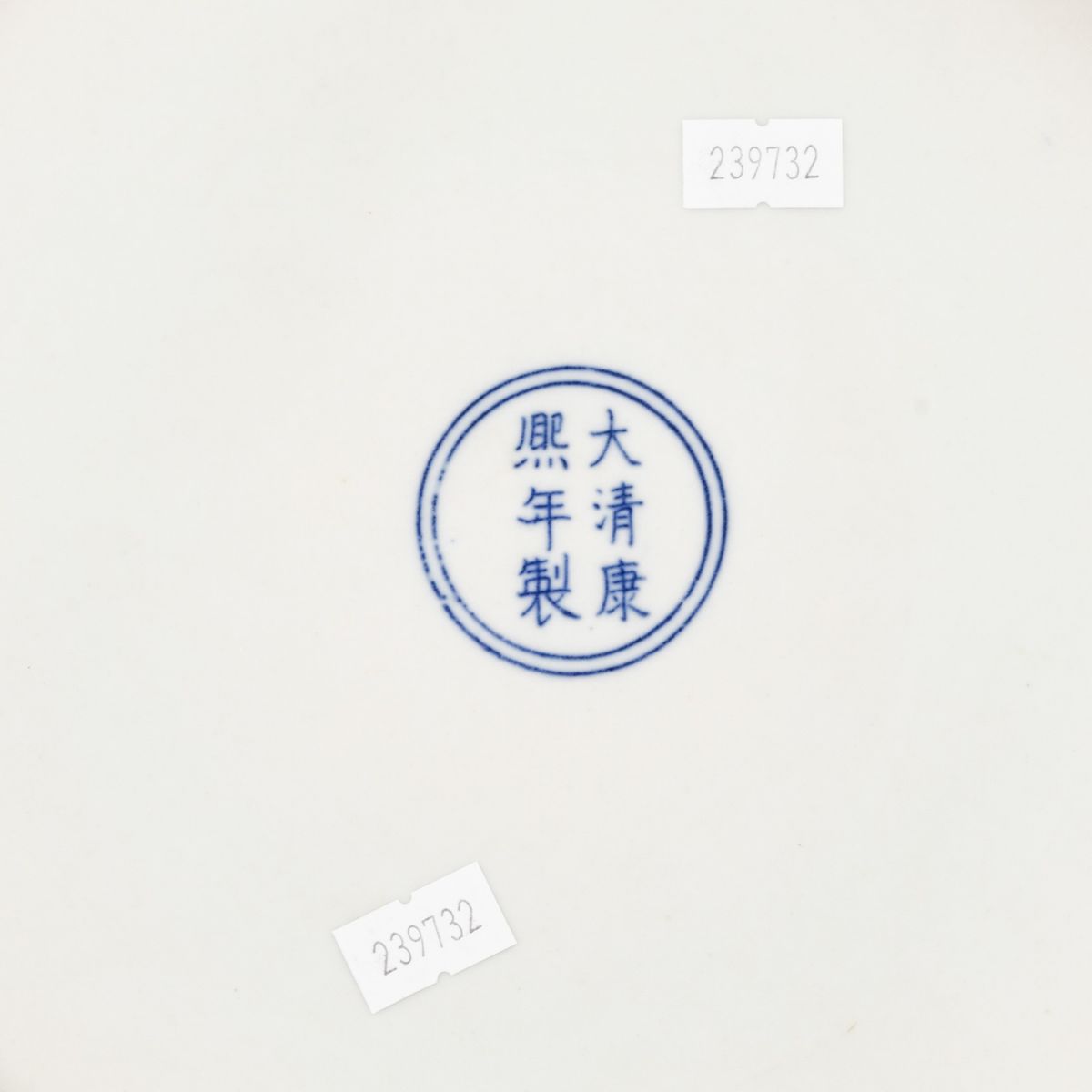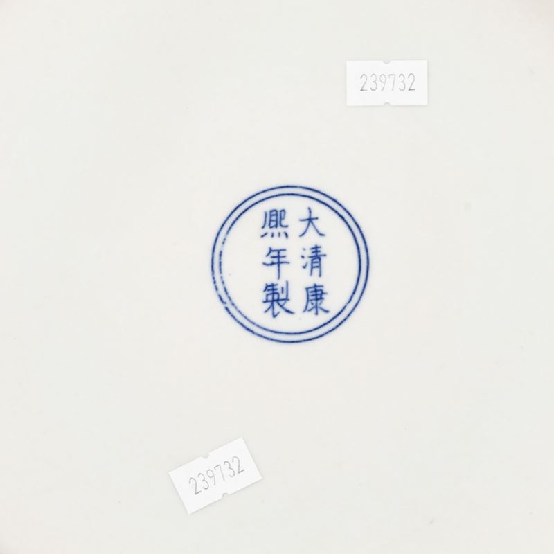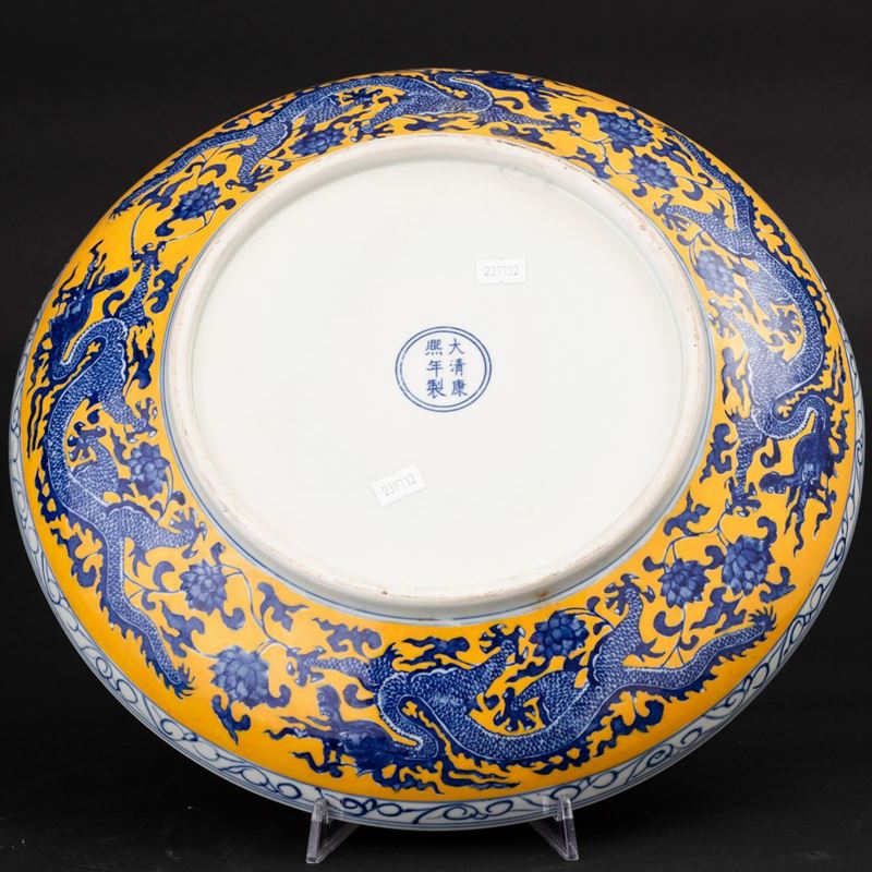 With a decor of dragons and lotus flowers on a yellow backdrop. Apocryphal Kangxi mark