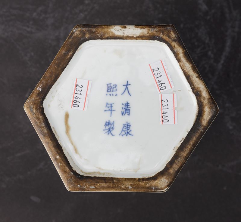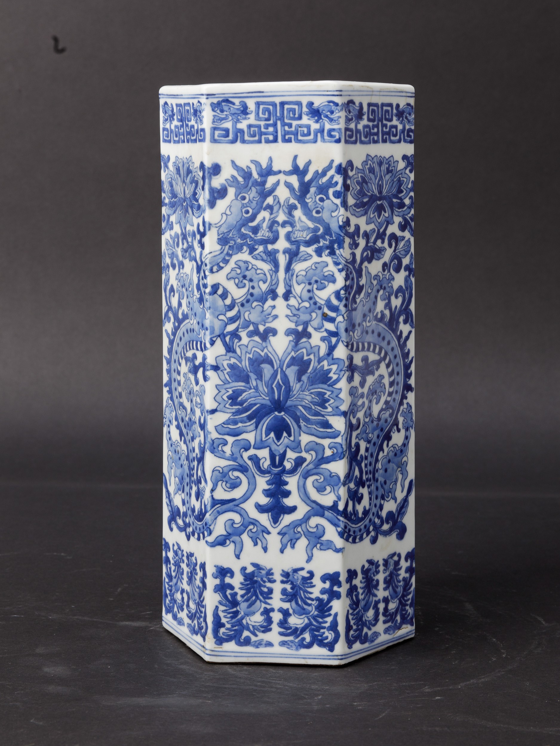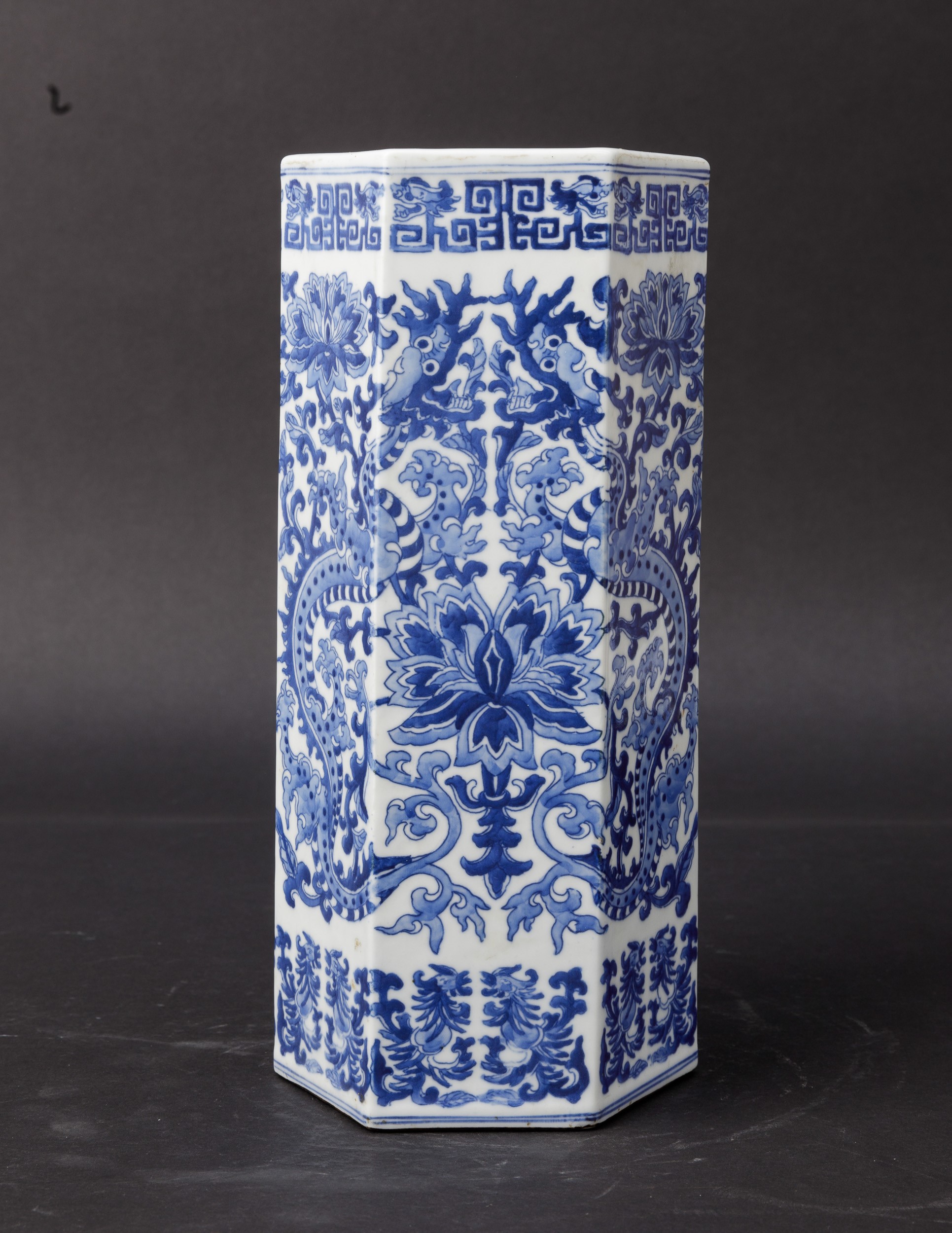 Blue and white porcelain with a decor of phoenixes, dragons and flowers. Hexagonal section.