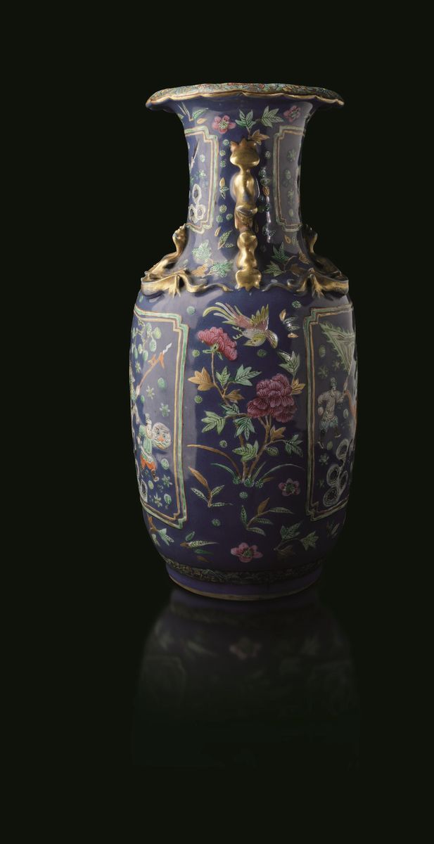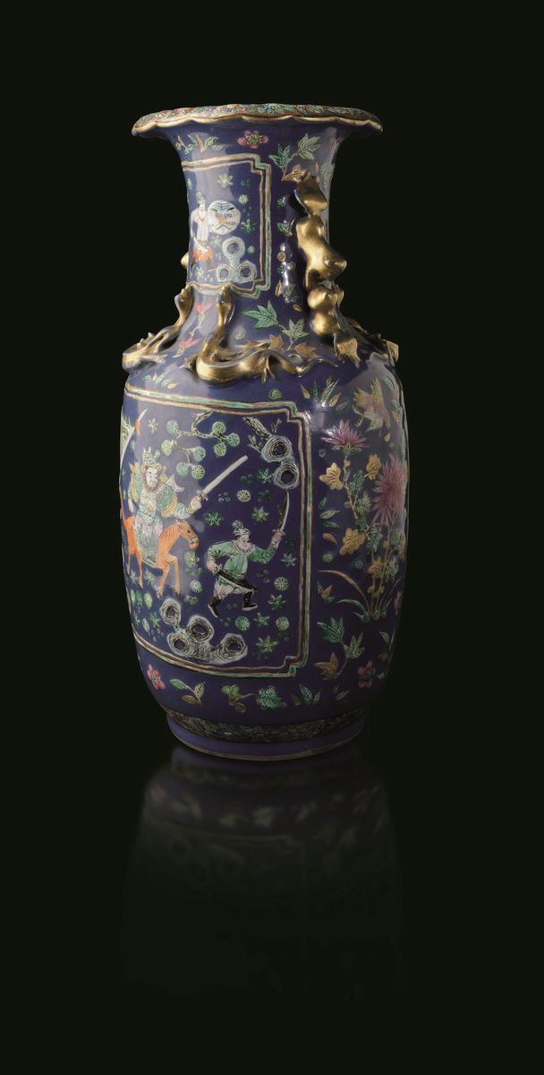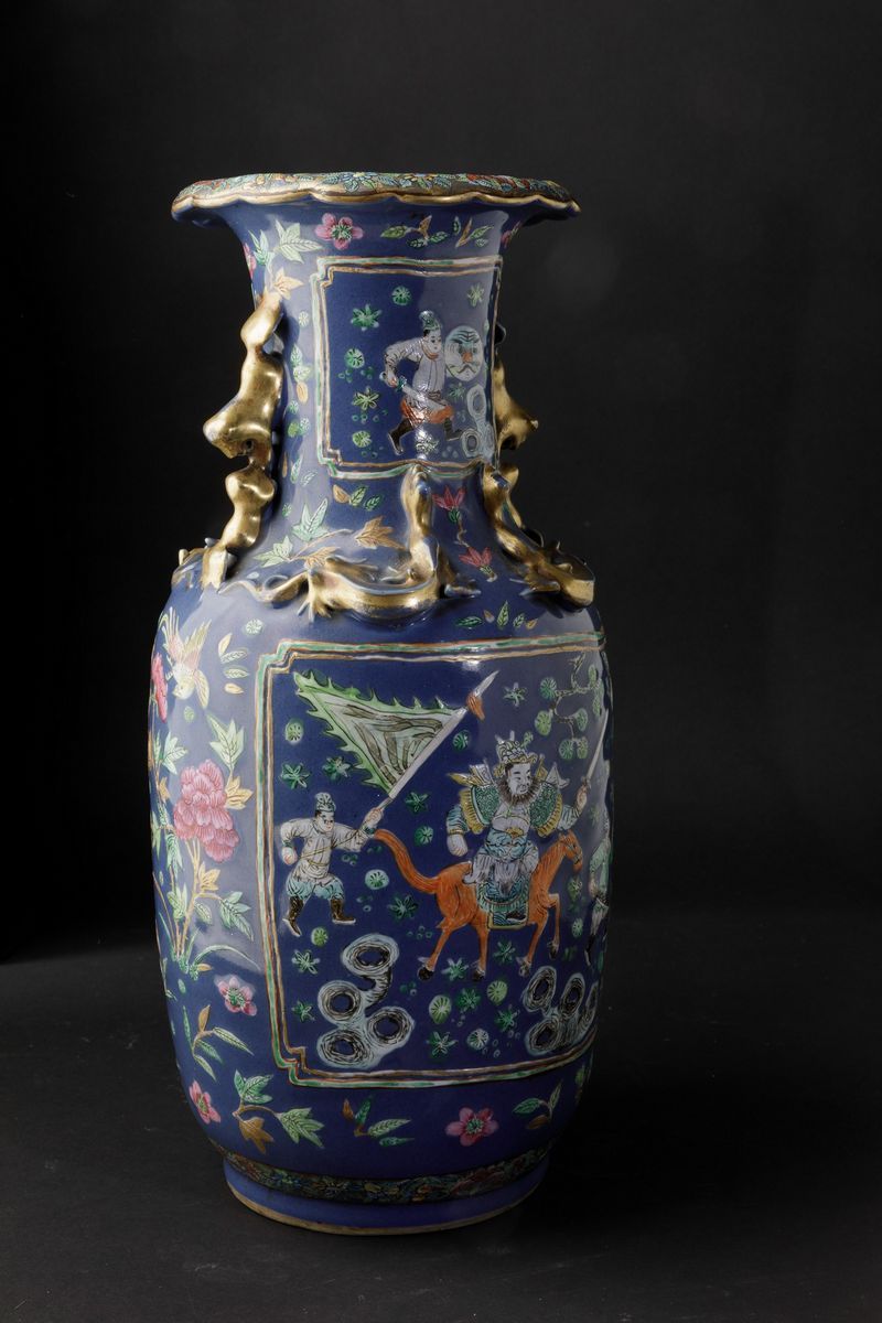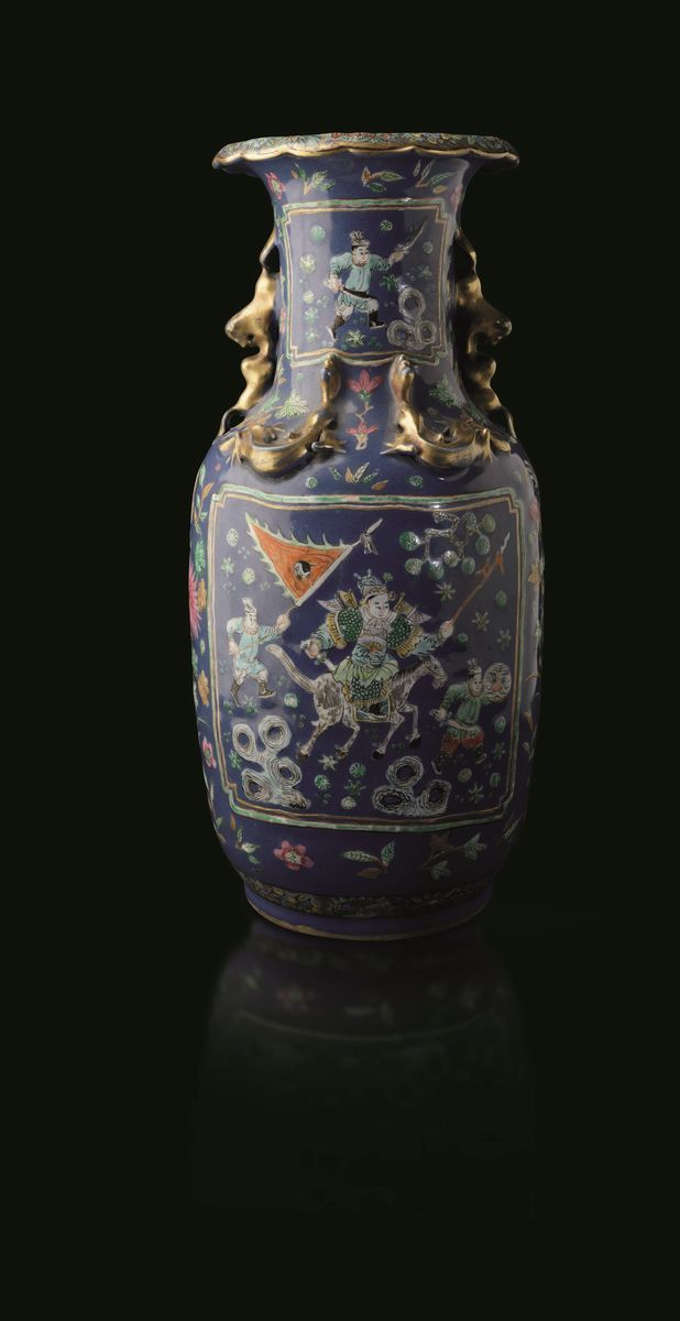 A porcelain vase, China, Qing Dynasty, 1800s Powder blue backdrop with figures of warriors, embossed dragons, and floral [..]