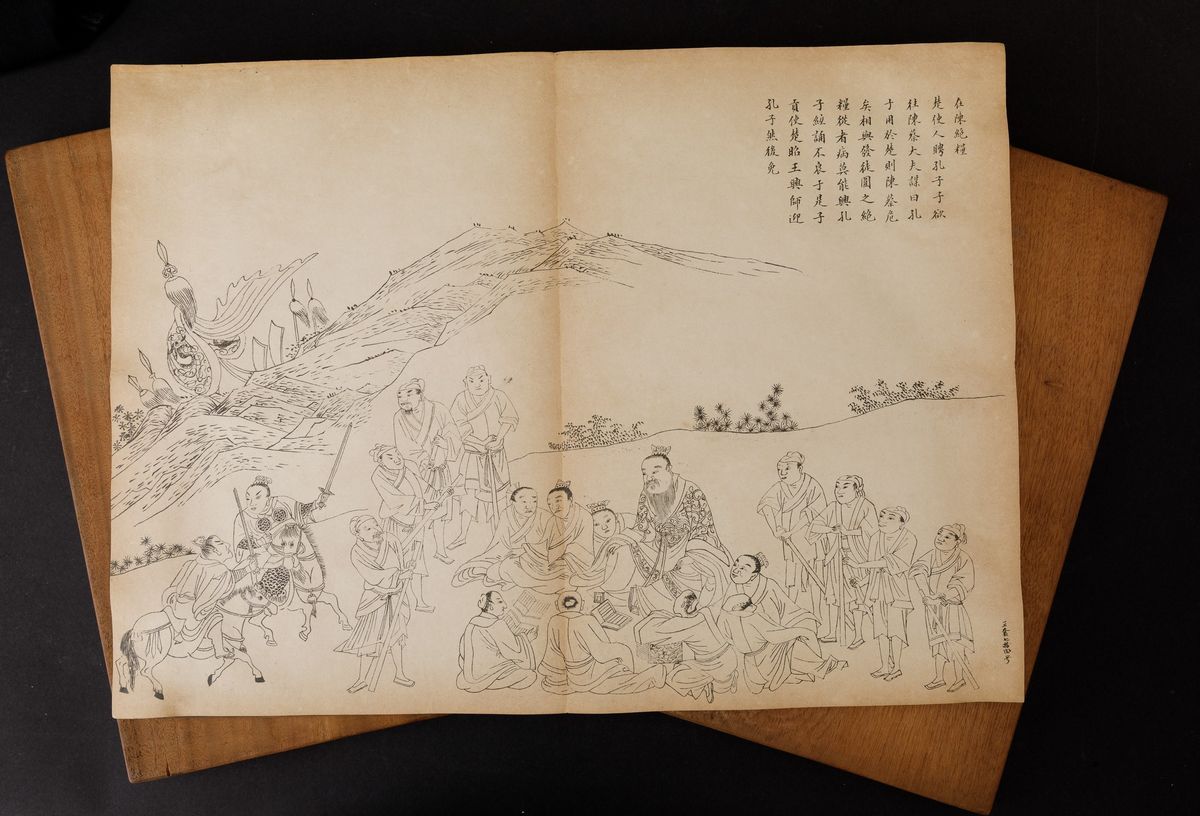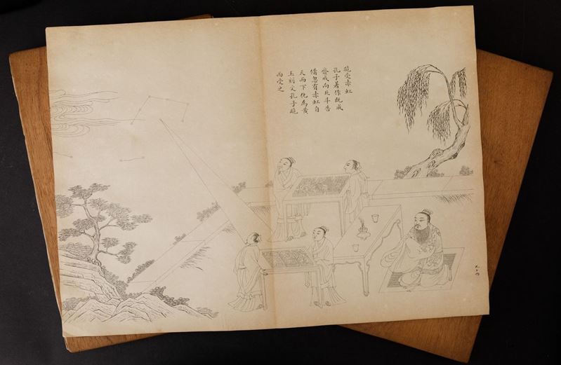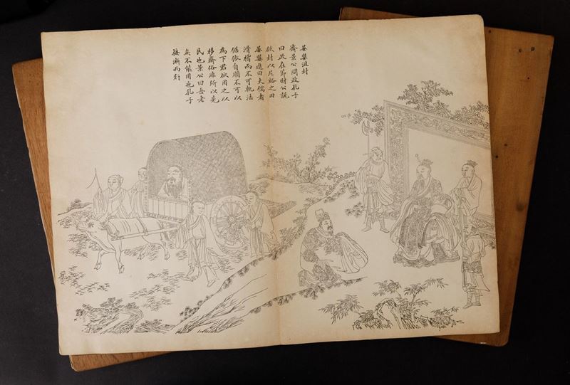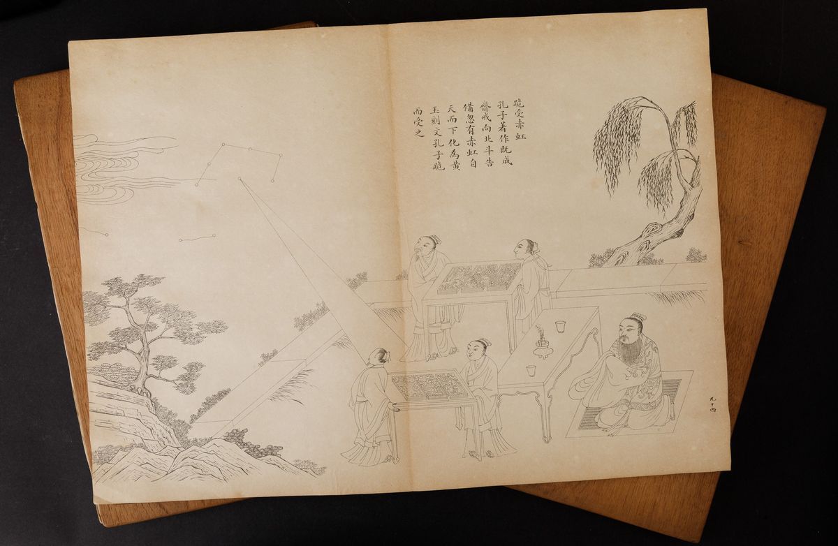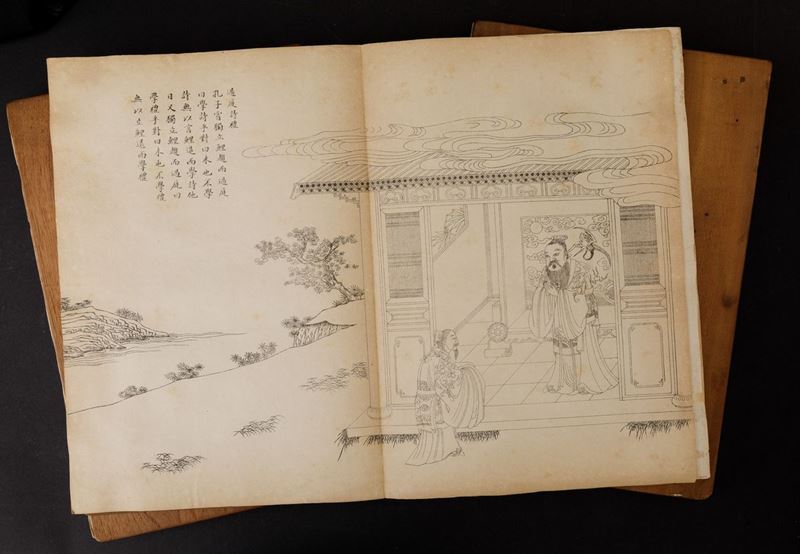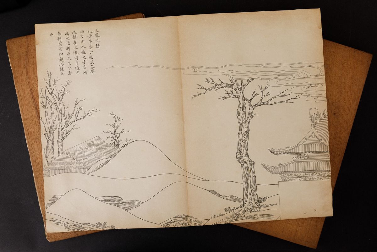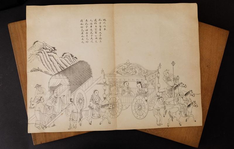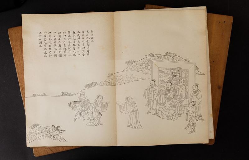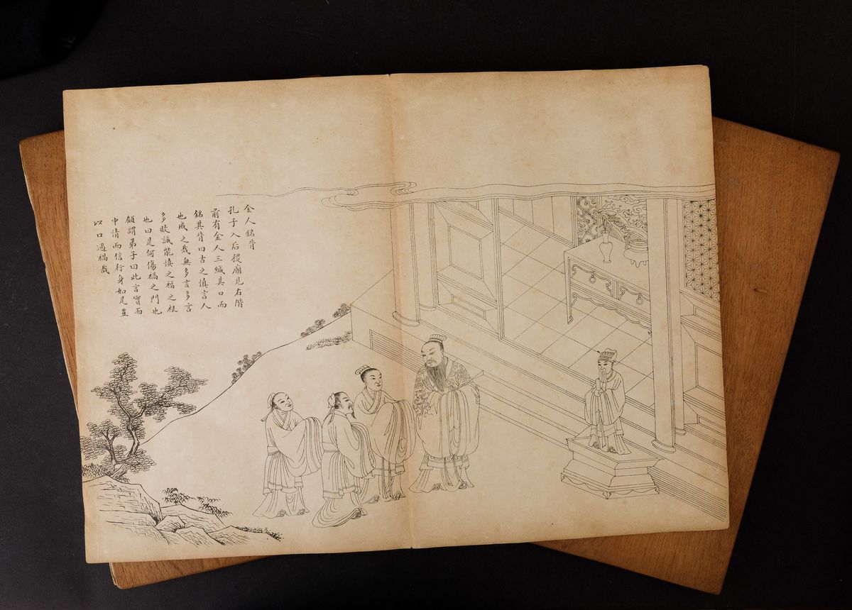 1800s. Three albums with wooden covers containing prints on paper with everyday life scenes and inscriptions.