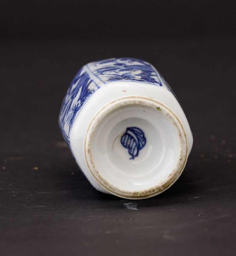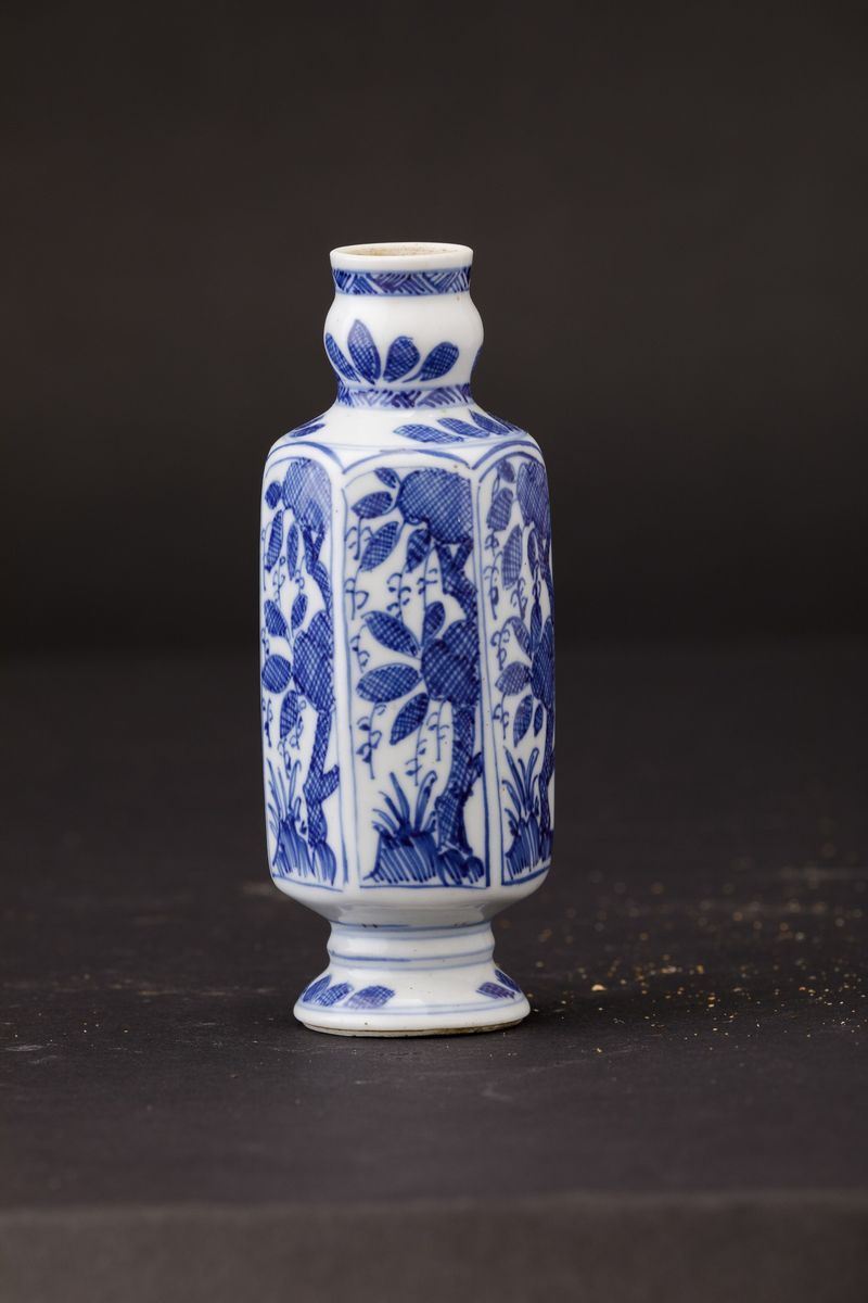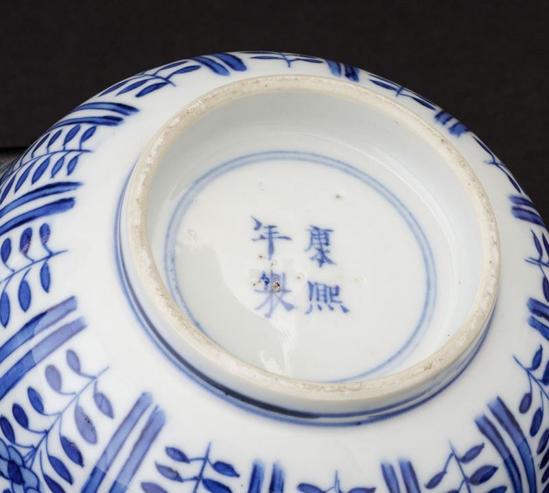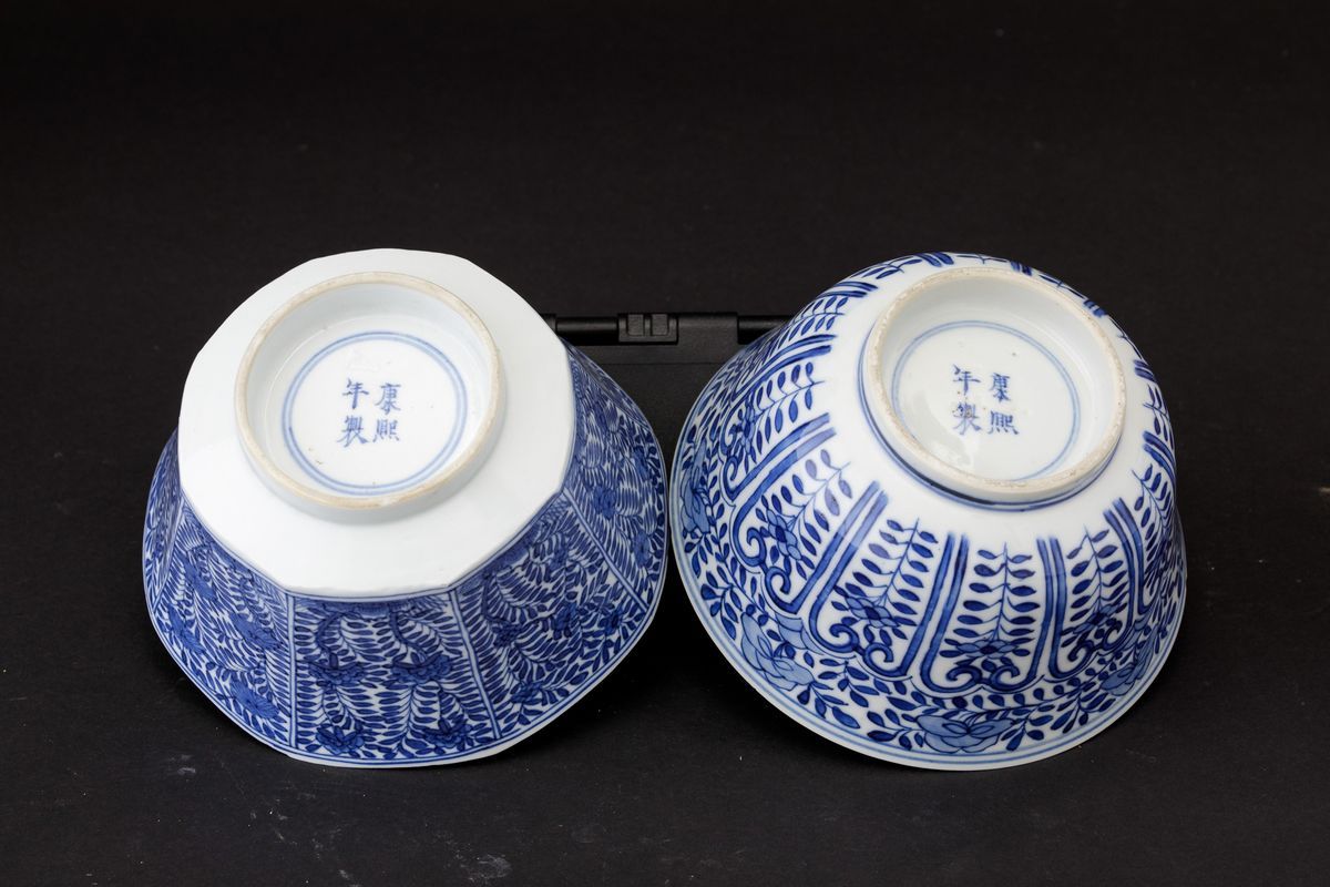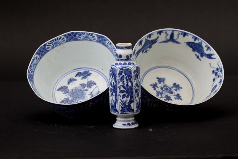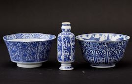 Kangxi period (1662-1722). Two bowls and a small vase in blue and white porcelain