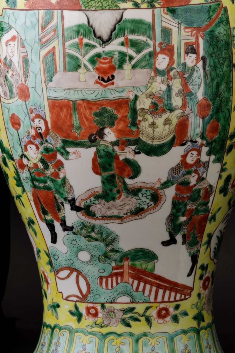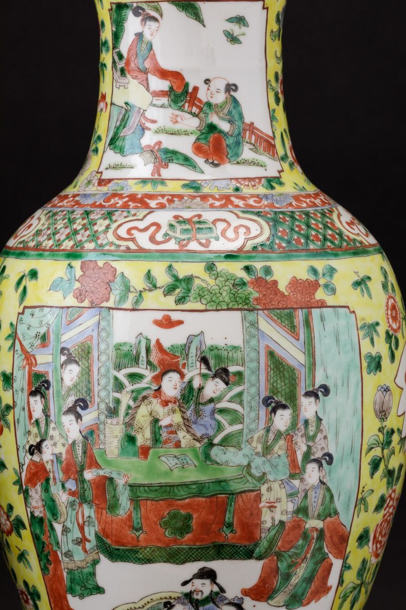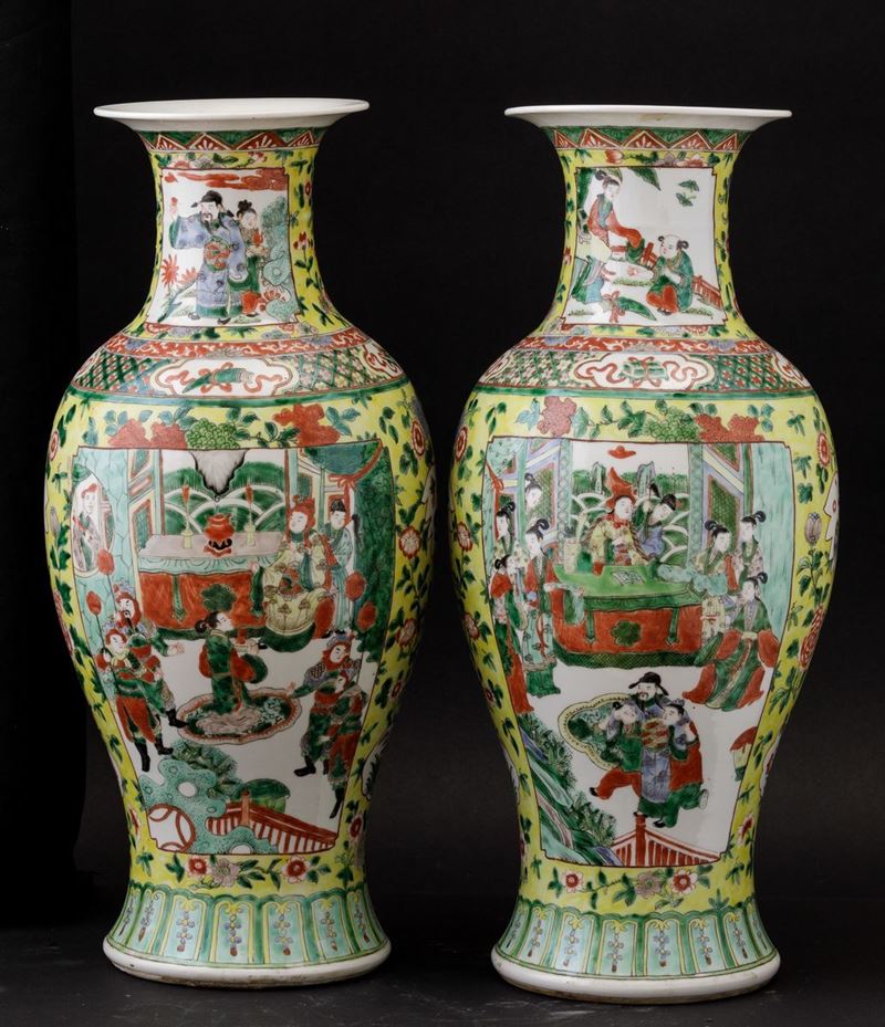 Early 1900s. Famille Vert porcelain with court life scenes and floral decors on a yellow backdrop.