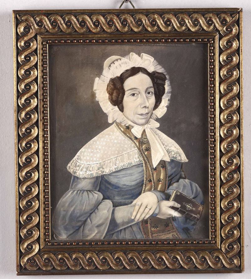 Artista della metà del XIX secolo Ritratto di signora in abito grigio azzurro con messale