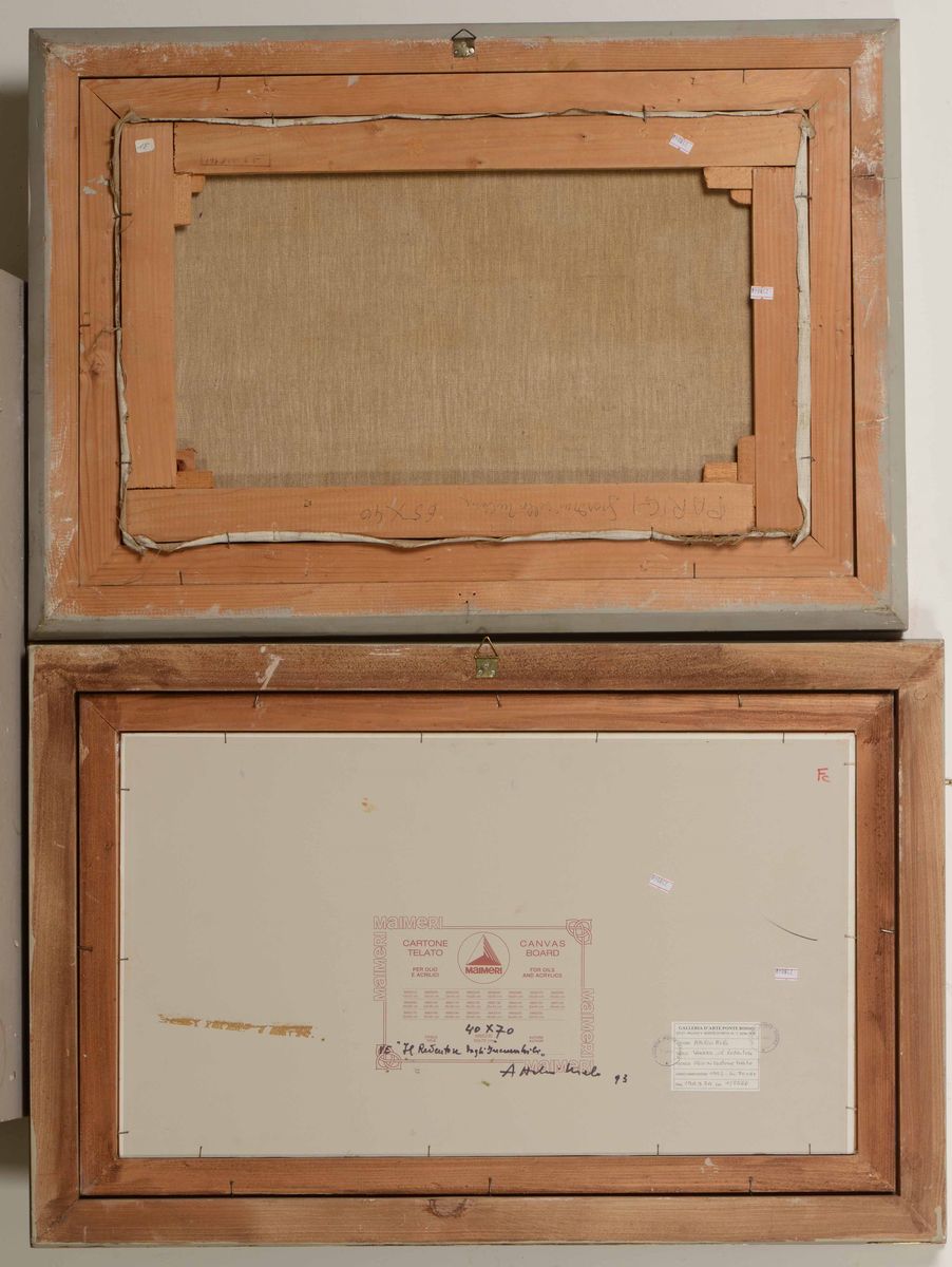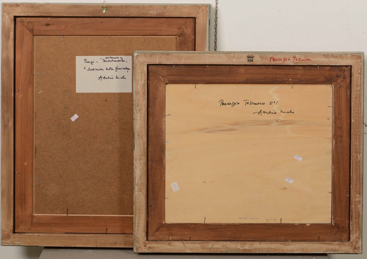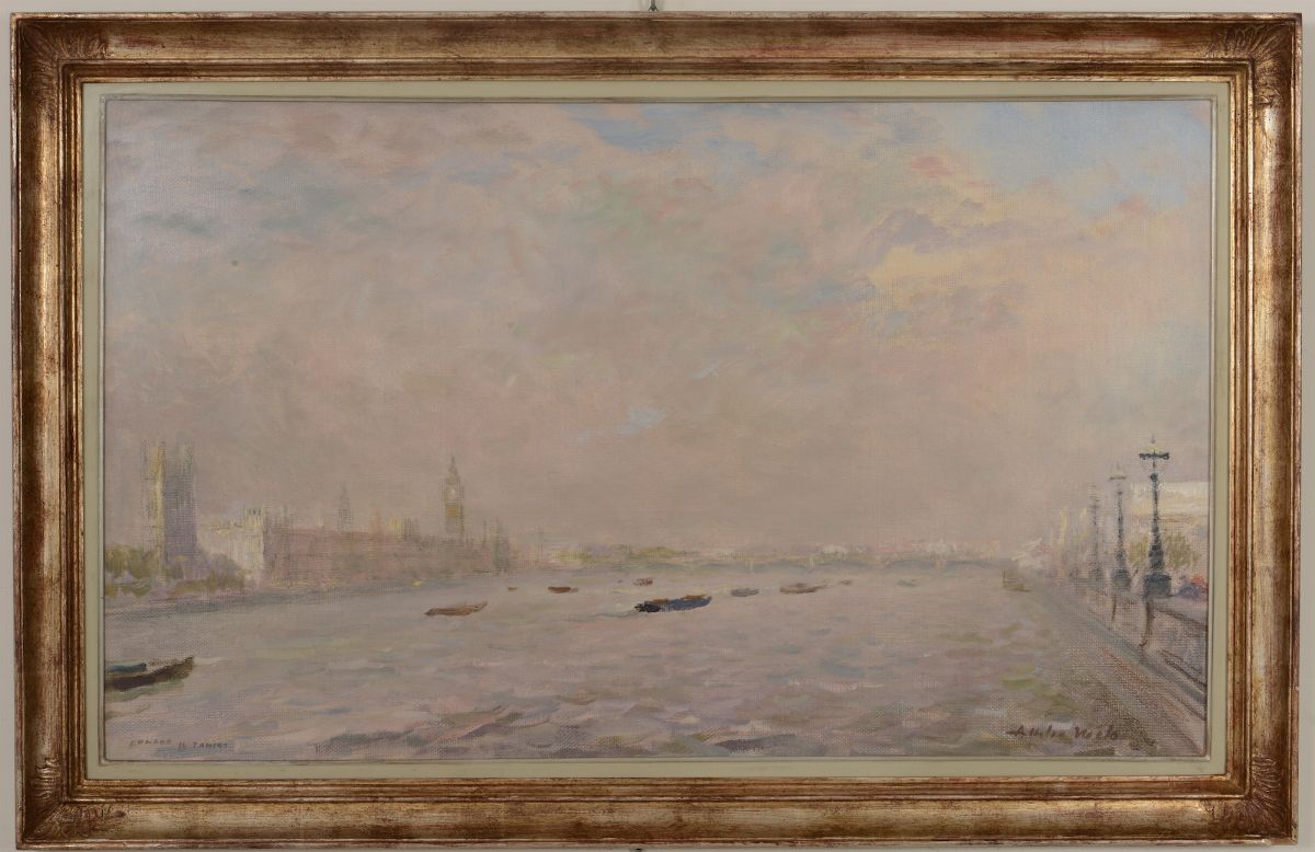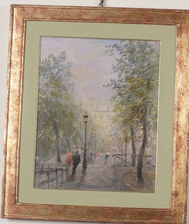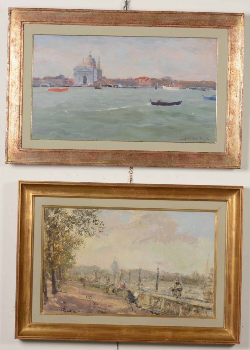 Lotto di cinque dipinti: Mont Martre Paris, olio su faesite cm 49x39 - Paesaggio Toscano n°1 olio su tavoletta cm 36x45 - Giardini a Parigi, olio su tela cm 65x40 - Venezia,Il Redentore olio su cartone telato cm 70x40, Londra, il Tamigi da Lambeth Bridge, olio su tela, cm 60x100