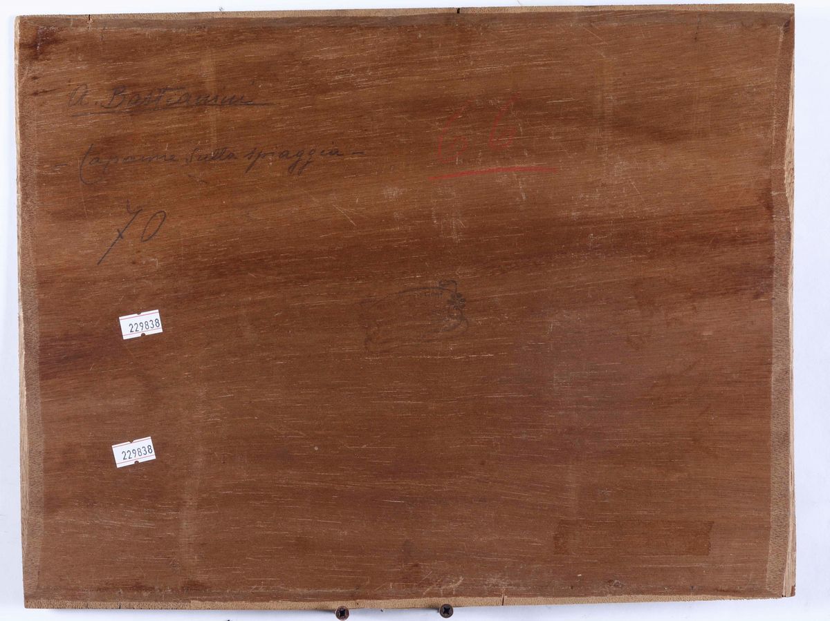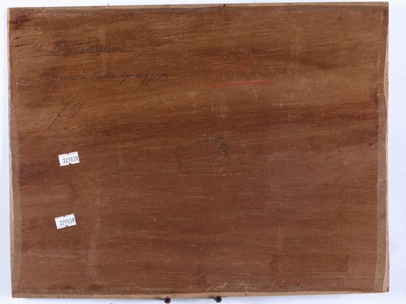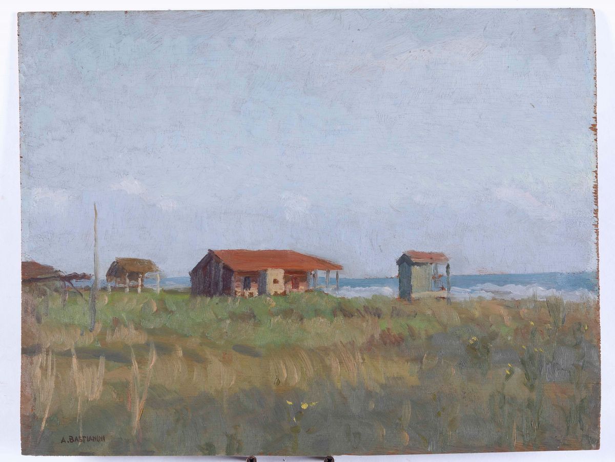2) Capanne sulla spiaggia, firmato “A. Bastianini” davanti e sul retro, olio su tavola, cm 33x41