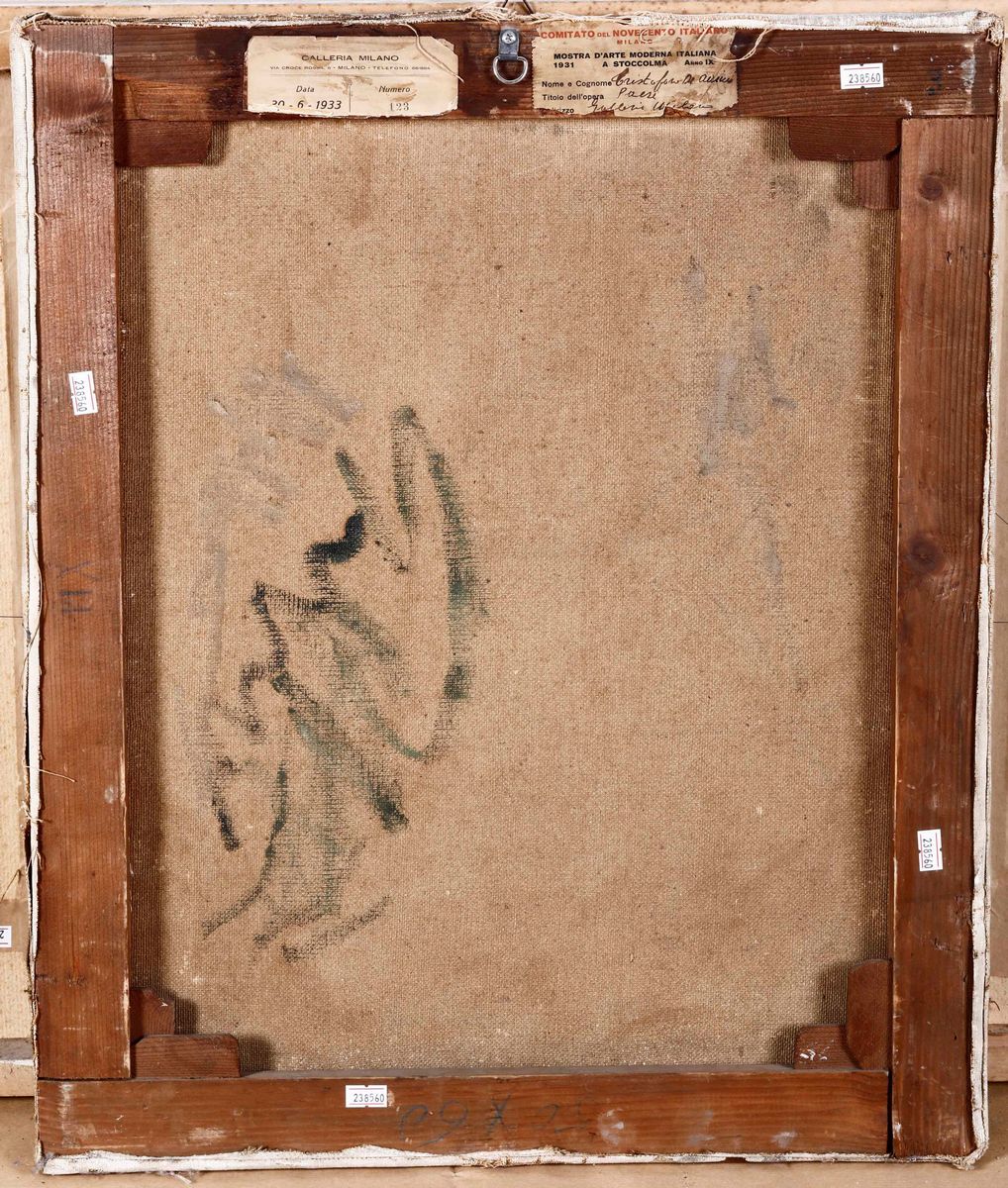 Etichetta mostra d'arte moderna italiana a Stoccolma 1931 ed etichetta Galleria Milano, via croce rossa 6, MI 1933.