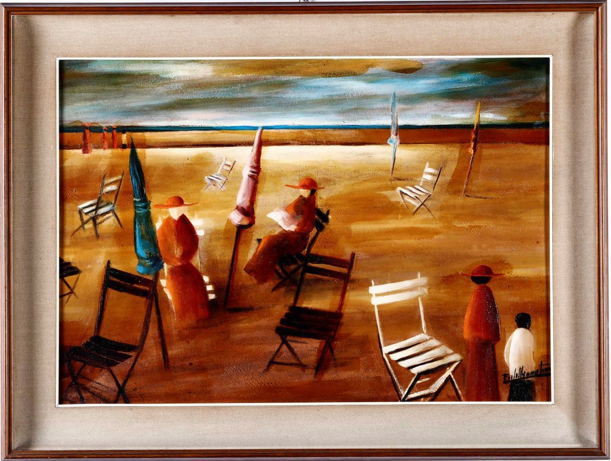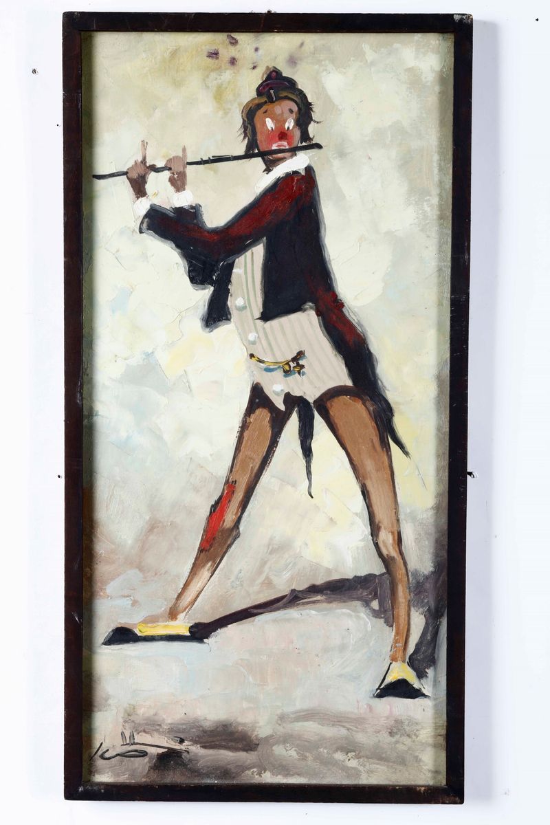 Lotto composto da due dipinti: Filippo Della Giustina, I Vescovi, olio su cartone, cm 50x70; Ciso Scotti, Pifferaio, olio su tela, cm 30x60
