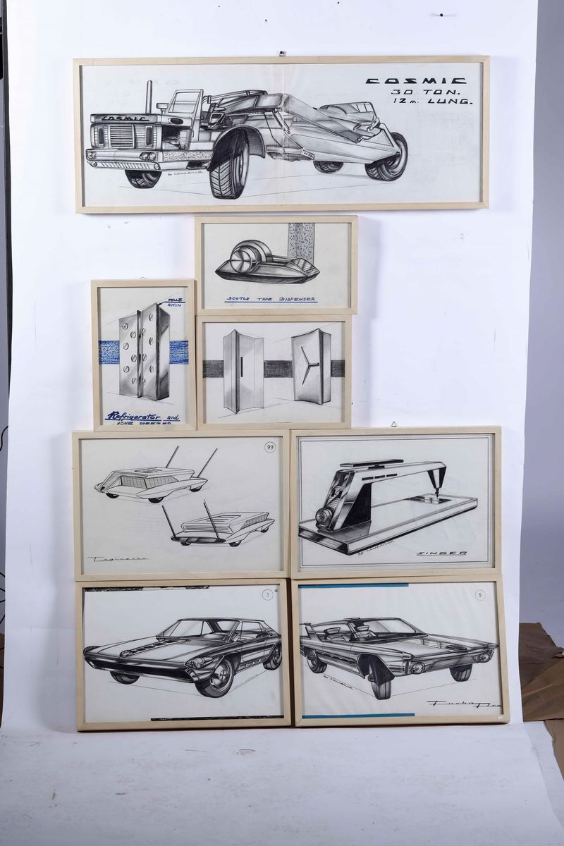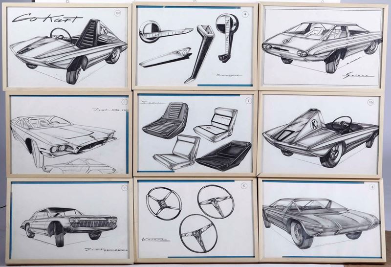 22 disegni, firmati “Lorenzo Castellaro” o “By Lorence”, 1960 ca, 14 raffiguranti auto di cui 2 ante recto, 3 raffiguranti camion, uno un trattore, uno un motoscouter e tre per accessori auto + 4 recto/verso raffiguranti “Utensili”