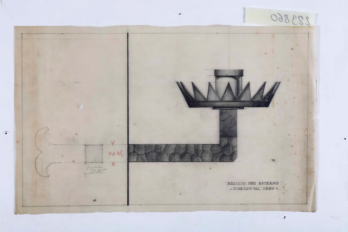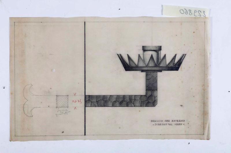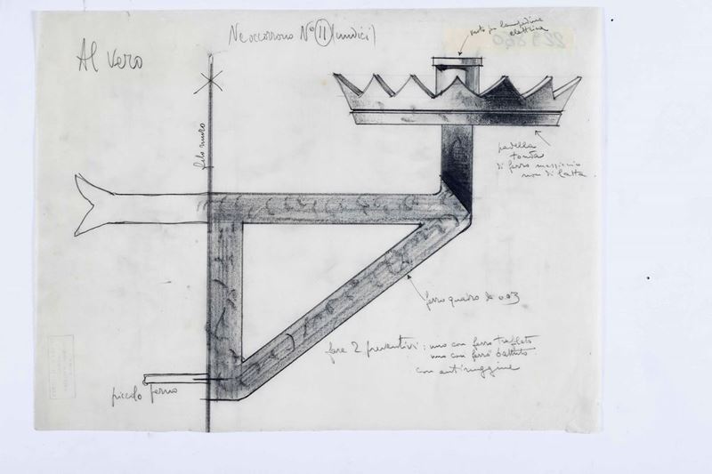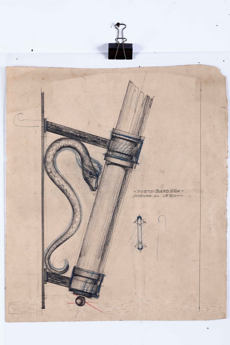 11 disegni su carta da lucido, matita e matite colorate, tutti con timbro, Virgilio Marchi - Architetto - Via Mariano Fortuny 5 - Roma)