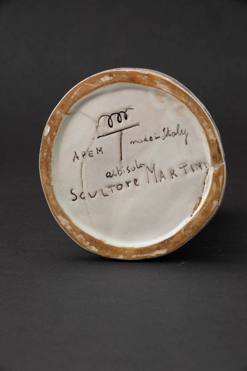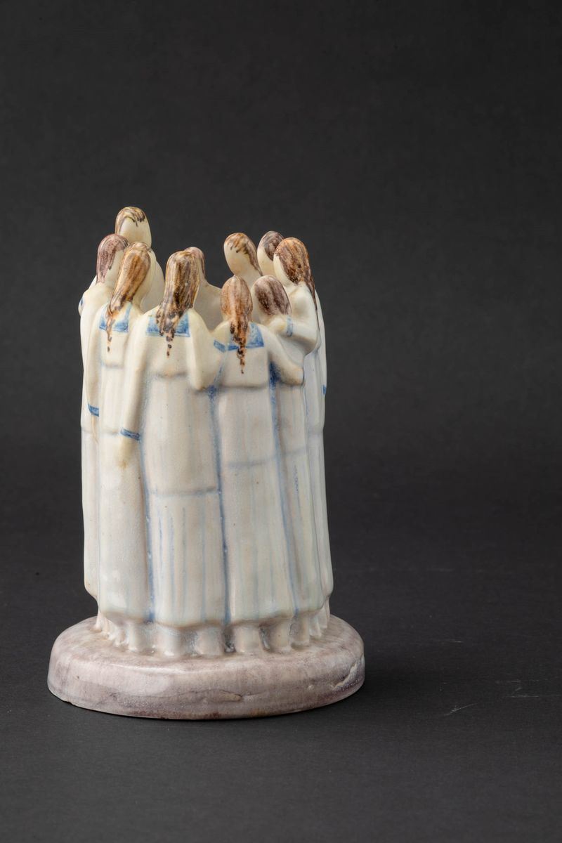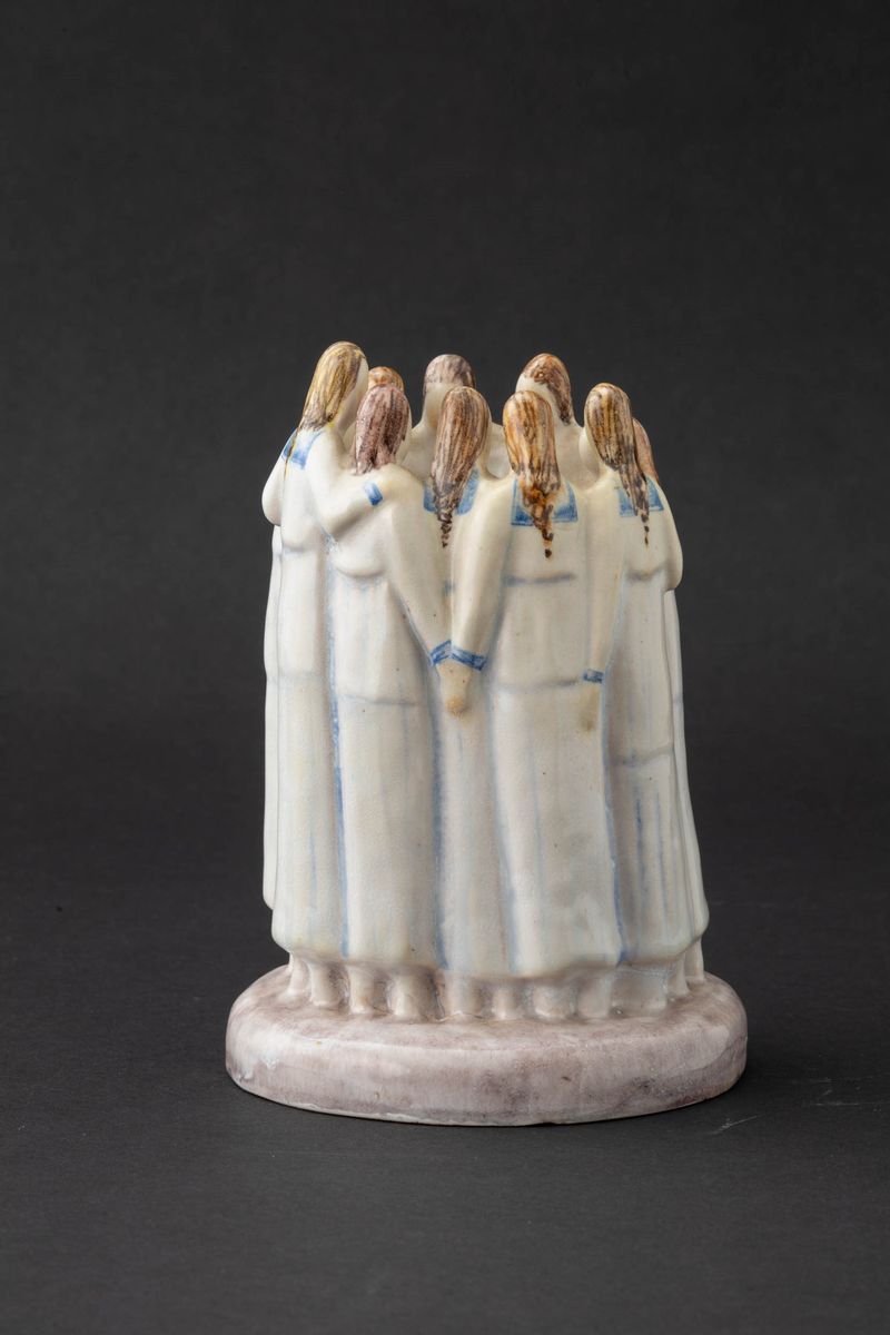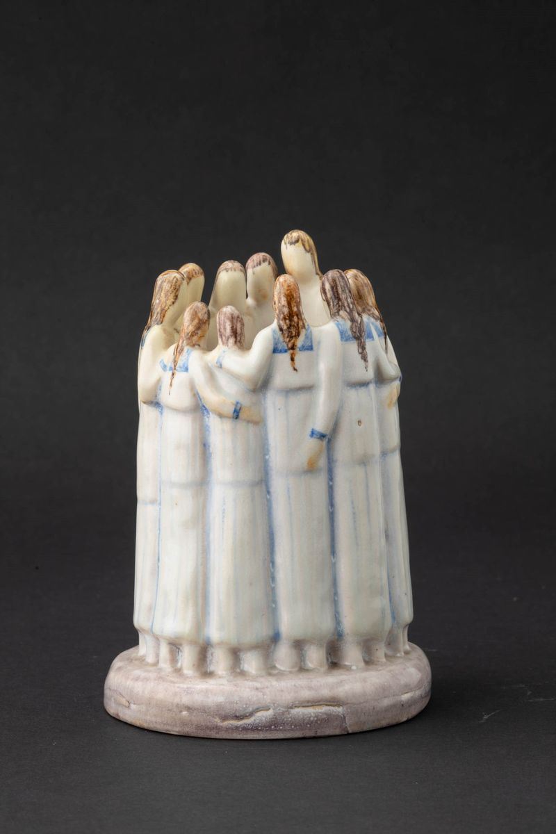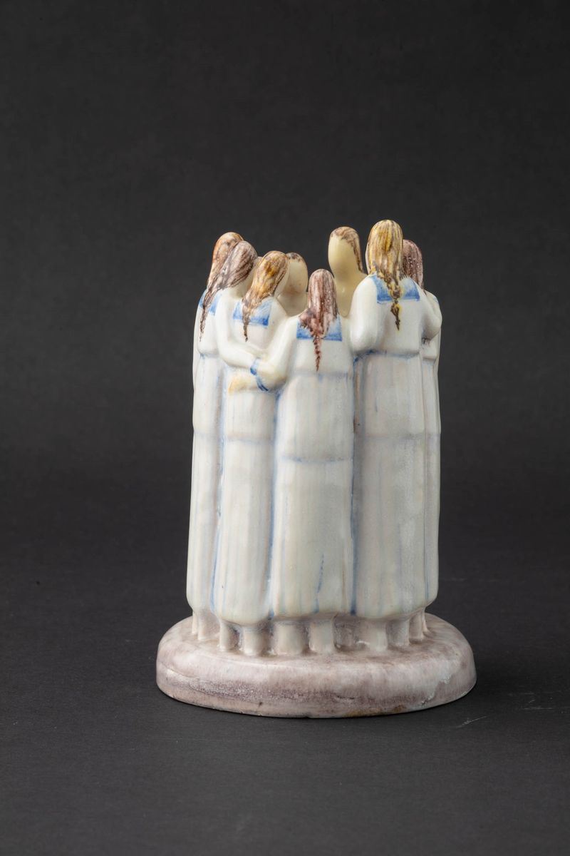 La Fenice, Albisola 1927 ca. Majolica terracotta sculptue of group of women around a circle with polychrome decor. Signature APEM Made in Italy Albisola, sculptor Arturo Martini. H cm 18, diam. cm 12.5