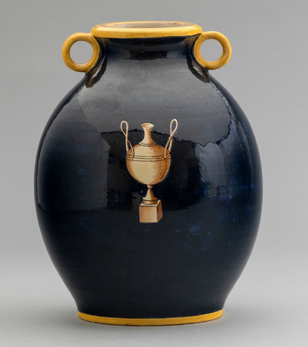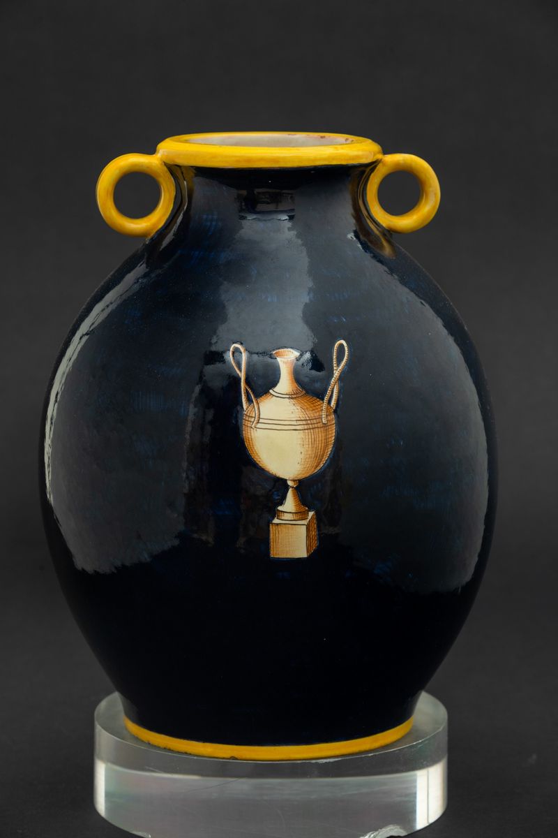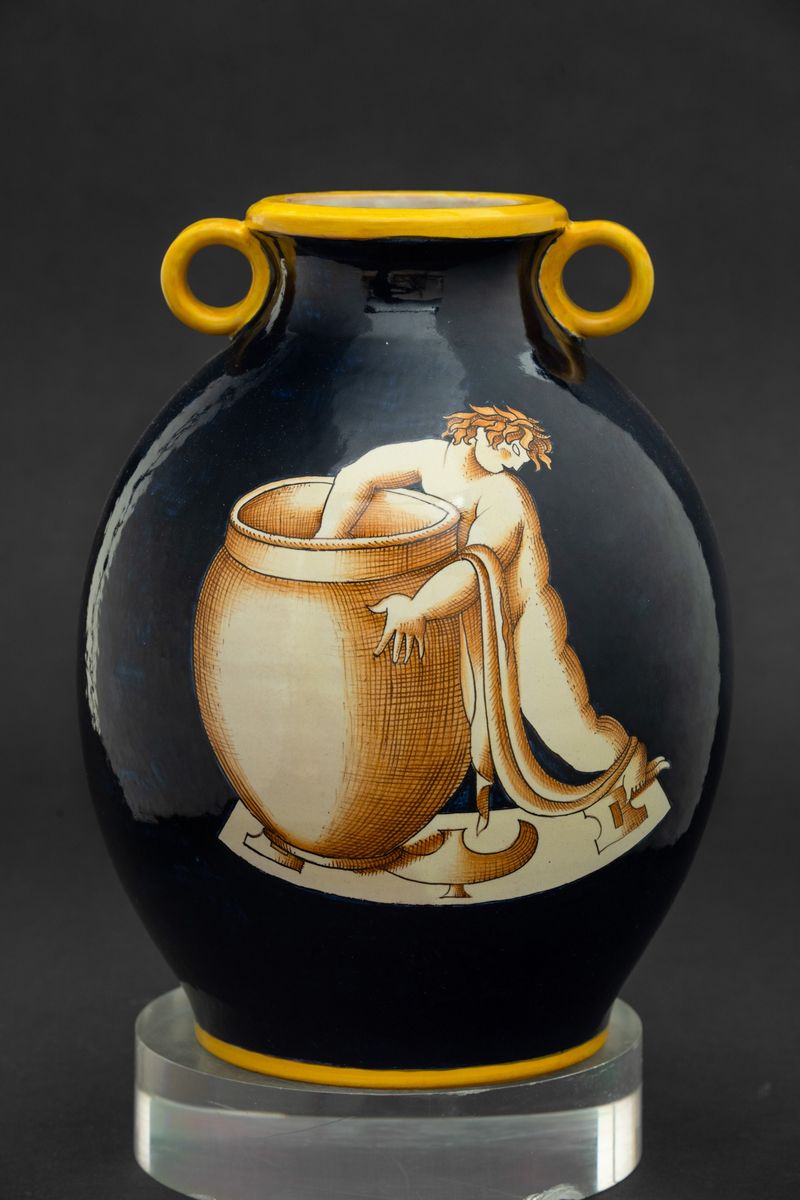 Vaso a orcio con anse circolari in maiolica con decoro di putto con vaso e drappeggio e sul verso anfora in grisaille su fondo blu