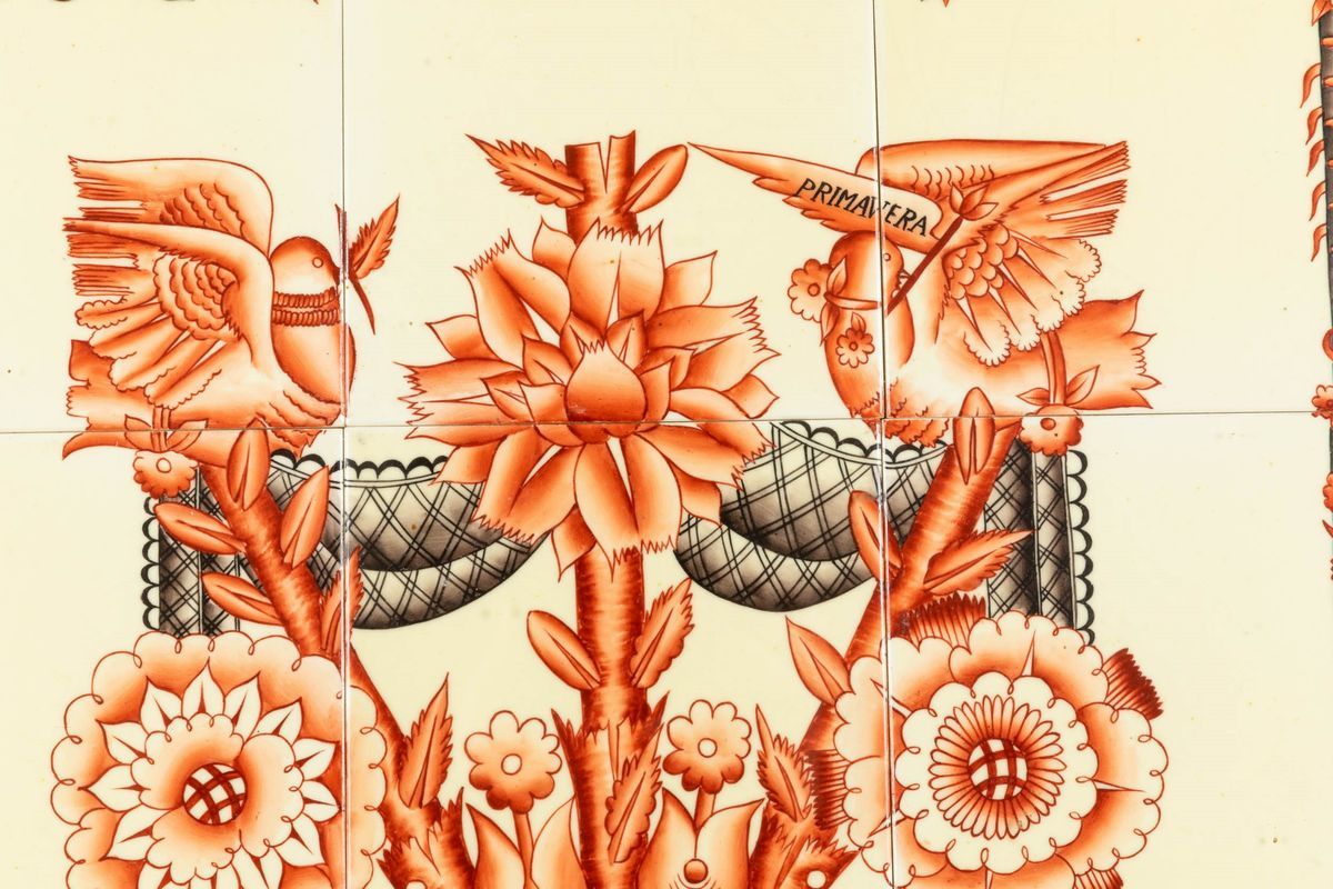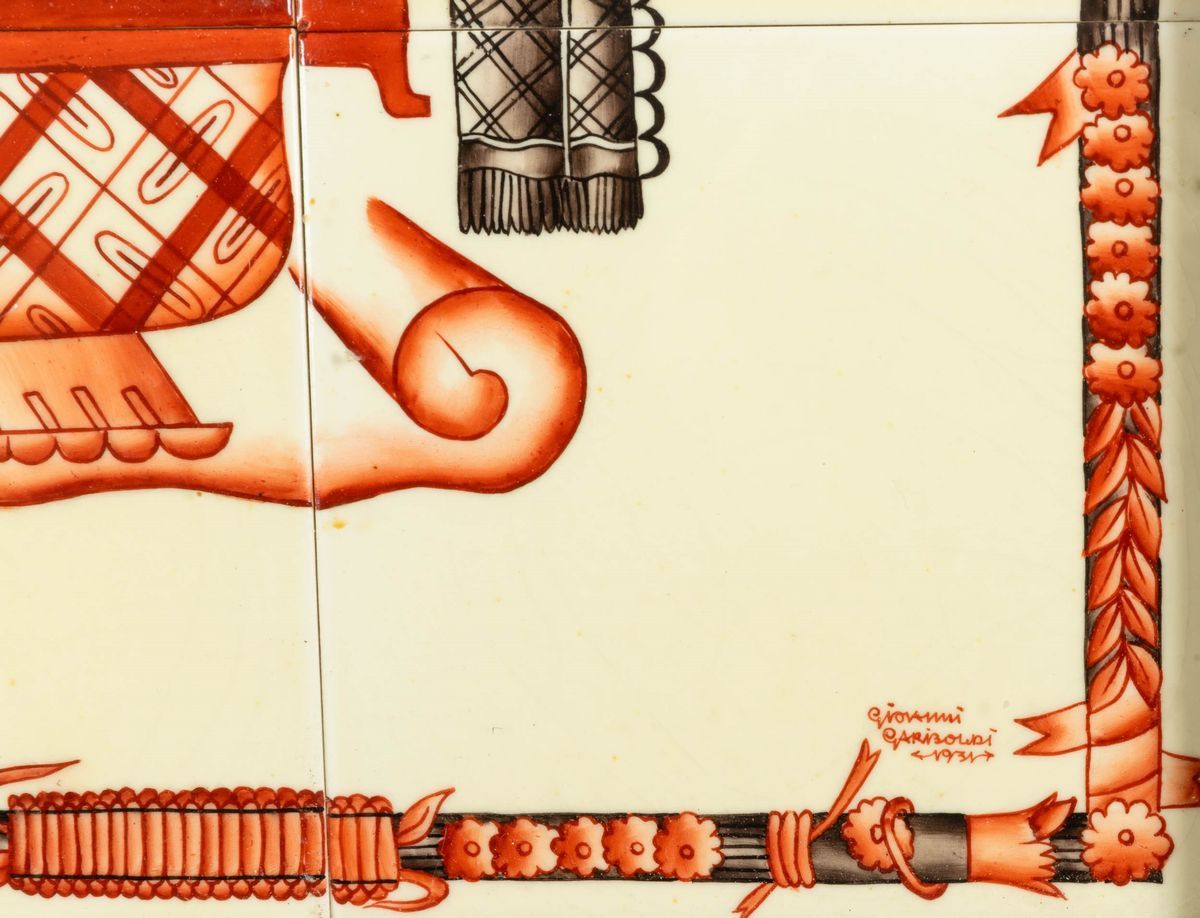 Grande placca decorativa in terraglia formata da nove piastrelle con decoro di smalti policromi