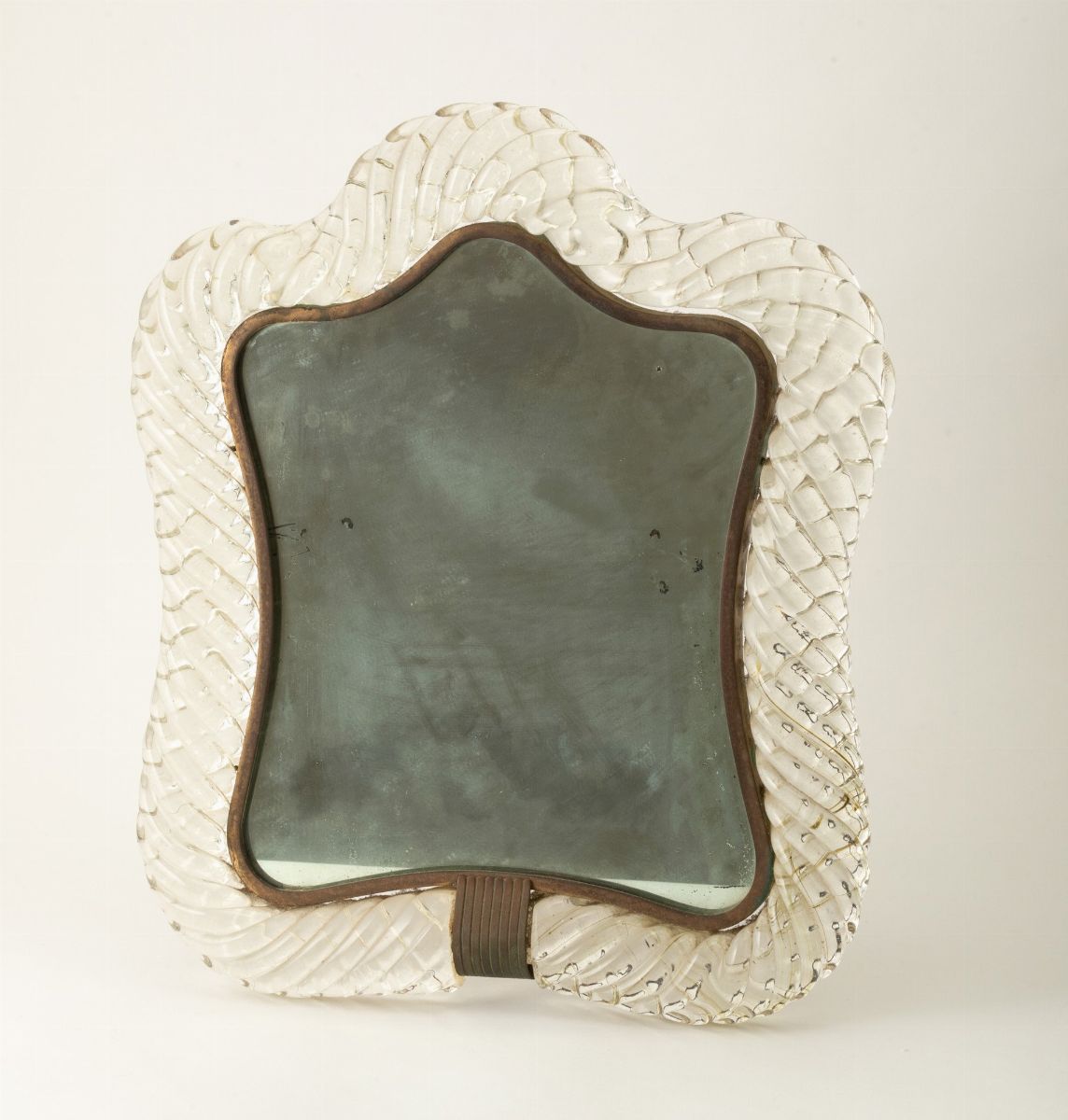 Specchiera da tavolo di forma sagomata in vetro a torciglione con struttura in ottone