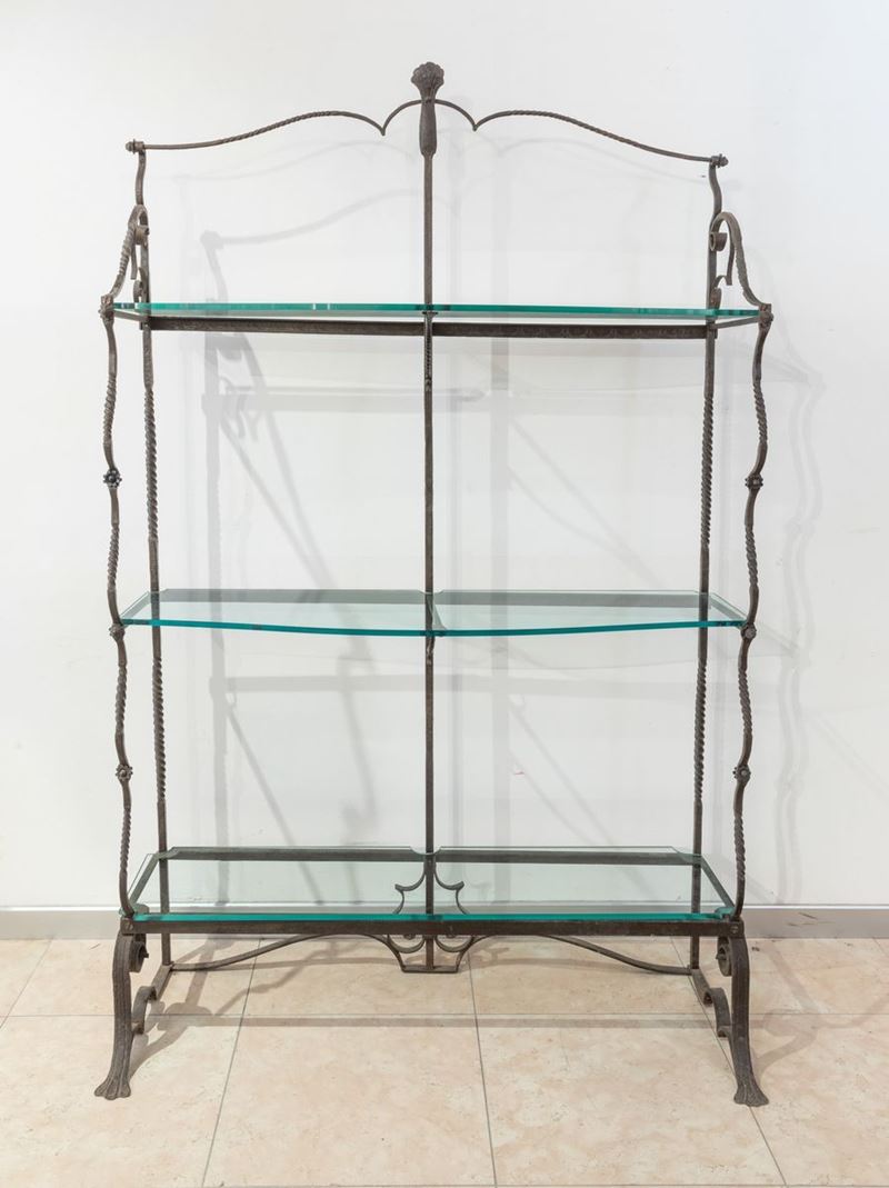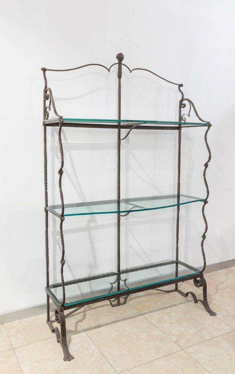 Raro espositore in ferro forgiato con ripiani in cristallo