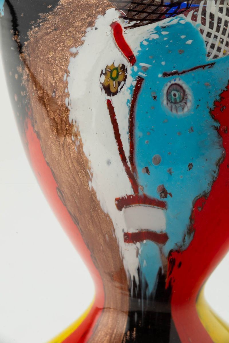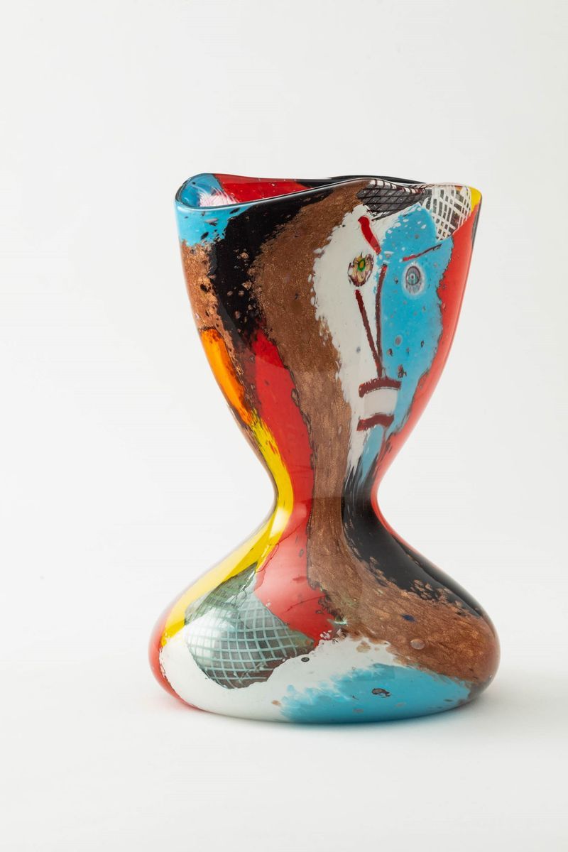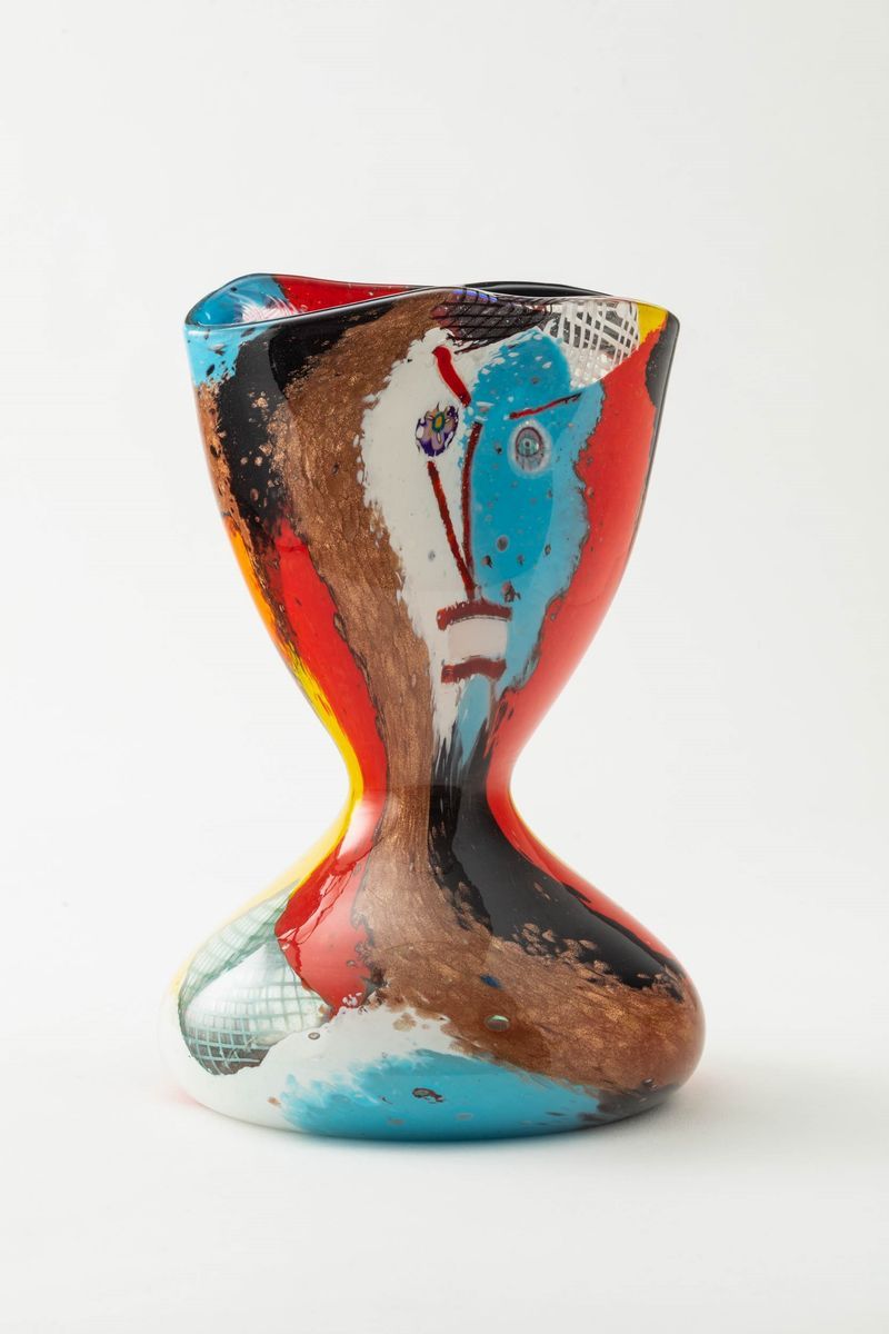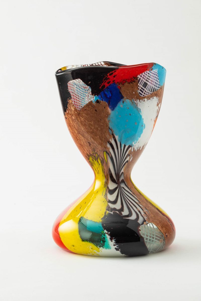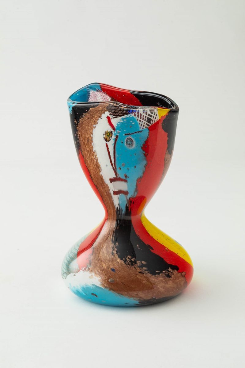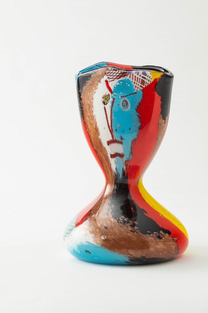 Raro vaso Geltrude serie Oriente in vetro soffiato in forma di clessidra con decoro di macchie in vetro policromo, tessere di canne a reticello e zanfirico, avventurina e volto stilizzato a canne e murrine