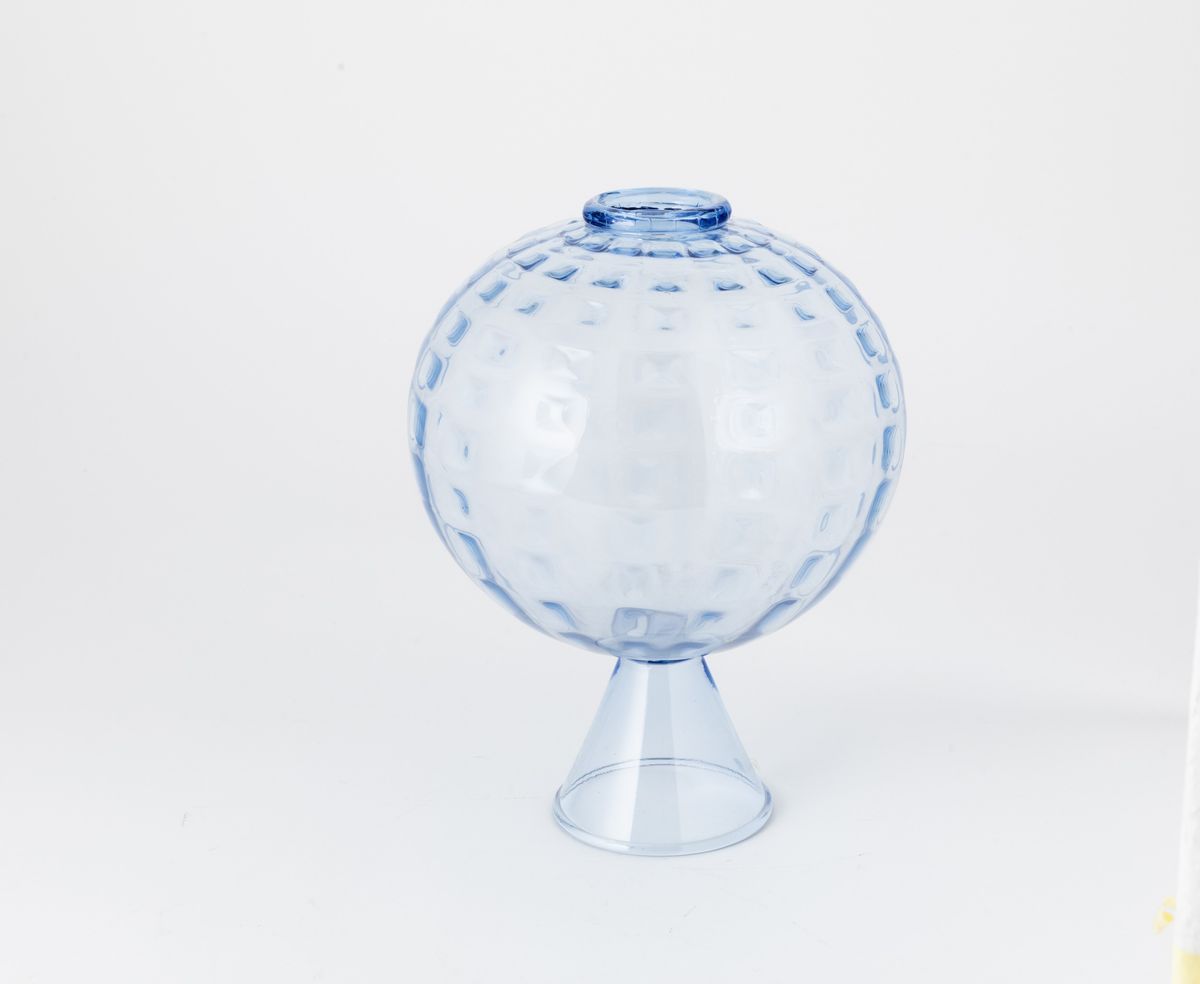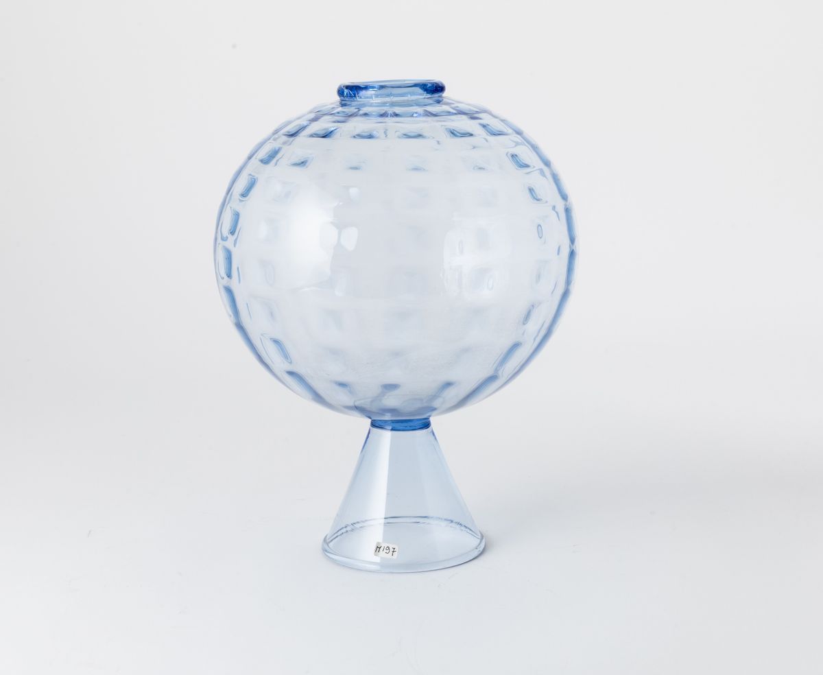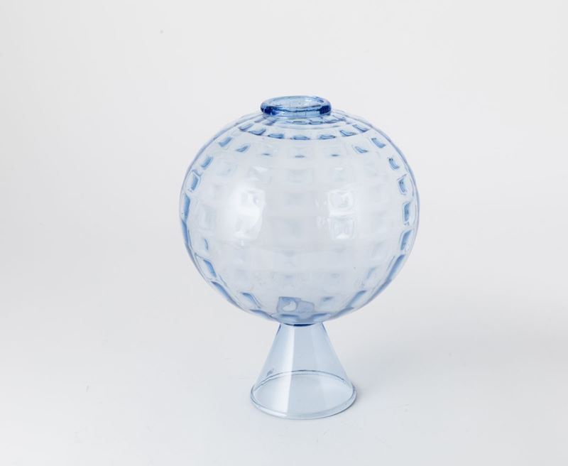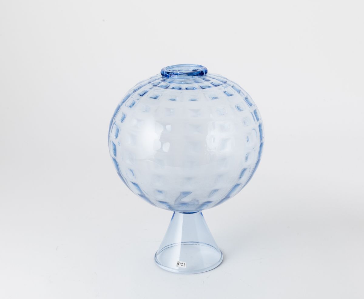 Vaso a sfera con collo applicato e superficie diamantata in sottile vetro soffiato azzurrino su alto piede troncoconico Vecchia etichetta
